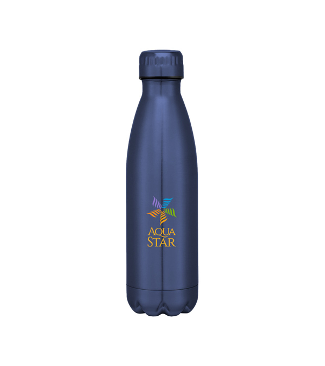 17 oz. double wall Stainless Steel vacuum insulated bottle. Designed for use with either hot or cold beverages. Screw on/off lid Fits most auto cup holders Do not microwave Hand wash only Full Color Digital Decoration Item size: 17 oz., 9.75″ H x 2.75″ Dia. Imprint area: Side: 3″ W x 3.5″ H (full color) / Vertical: 2.5″ W x 4.5″ H (full color) Imprint: Side: 6 lines / 20 characters per line Vertical: 4 lines / 27 characters per line Applicable charges: $56.00 set up charge $1.00 per pc per additional location