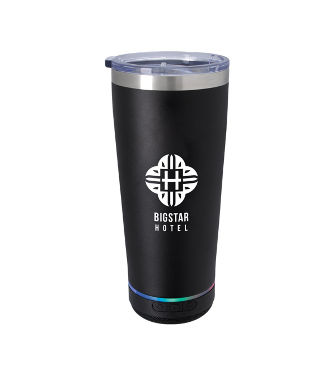 The 20 oz. Tumbler With Bluetooth® Speaker will keep beverages hot or cold for hours. The built-in speaker can be paired with devices up to 32 ft. away to play music. It’s a great item for outdoor activities, hikes, gym sessions, bike rides, and more. The double wall design makes it sweatproof, so users don’t have to worry about condensation causing a slippery hold or damaging the speaker. Add your imprint and this is an effective way to leave a lasting impression on anyone. Double-wall stainless steel construction Push-on, spill-resistant lid with slider opening Bluetooth® speaker at the bottom of tumbler Micro USB cable included to charge speaker Full charge in 1.5 hours, playback over 2.5 hours 500mAh battery Screen-printed decoration Item size: 8.25″ H x 2.5″ Dia (at base) Imprint area: Side 1 and 2: 2.5″ W x 3″ H (1 color max.) Imprint: Side 1 and 2: 8 lines / 18 characters per line Applicable charges: $60.00 set up charge