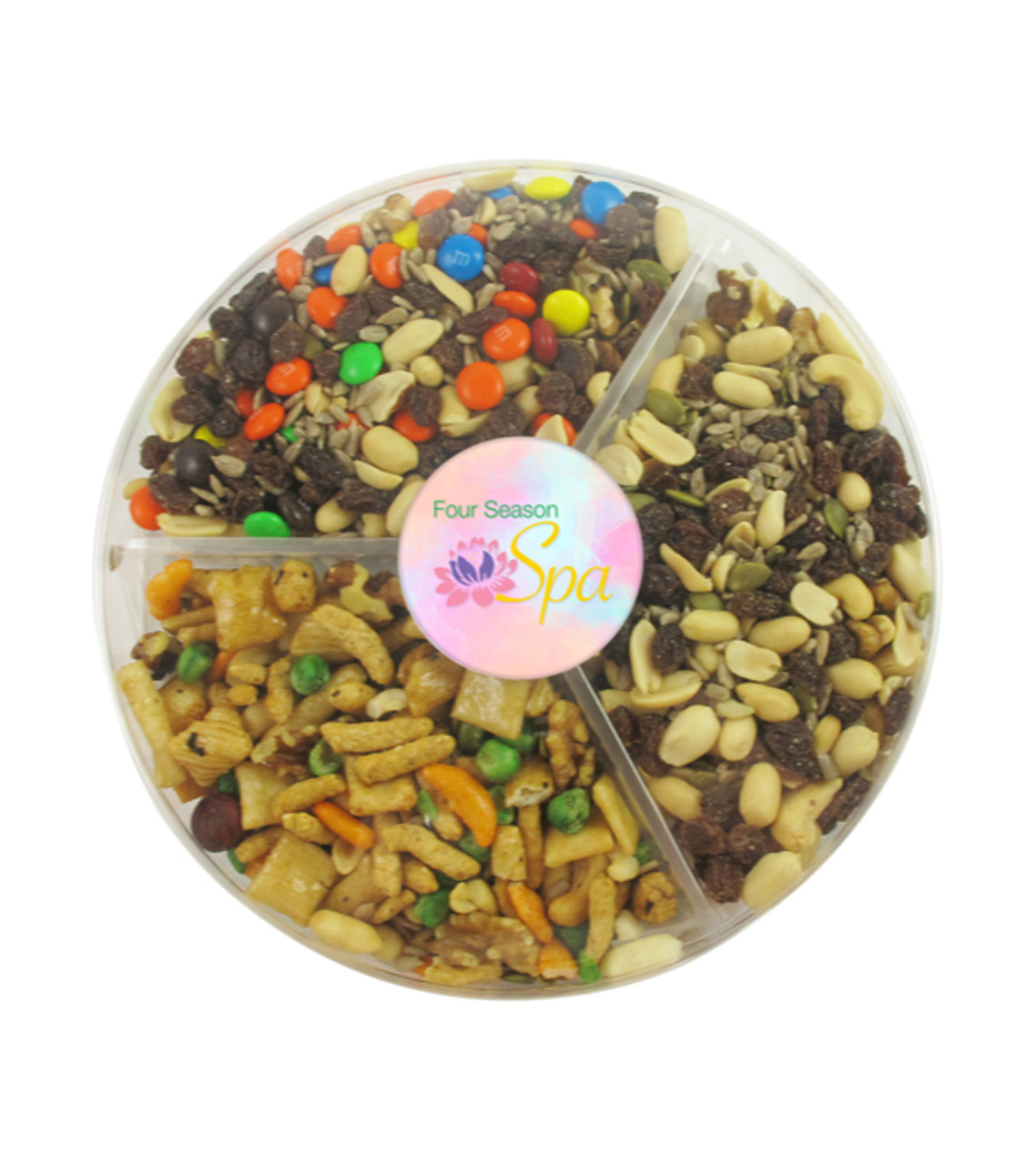 Get your logo seen on this attractive snack container, featuring a trio of sweet and savory trail mixes. Designed to draw a hungry crowd, it’s a great gift for client introductions and employee appreciation events. Sturdy, clear acetate box with 3 compartments 7 oz. Raisin Nut Trail Mix 7 oz. Rainbow Delight Trail Mix 7 oz. Oriental Trail Mix Full color digital label decoration Item size: 1.125″ H x 8.75″ D Imprint area: Front: 2.75″ round x 3″ label (full color) Imprint: Front: 8 lines / 22 characters per line Applicable charges: $60.00 set up charge
