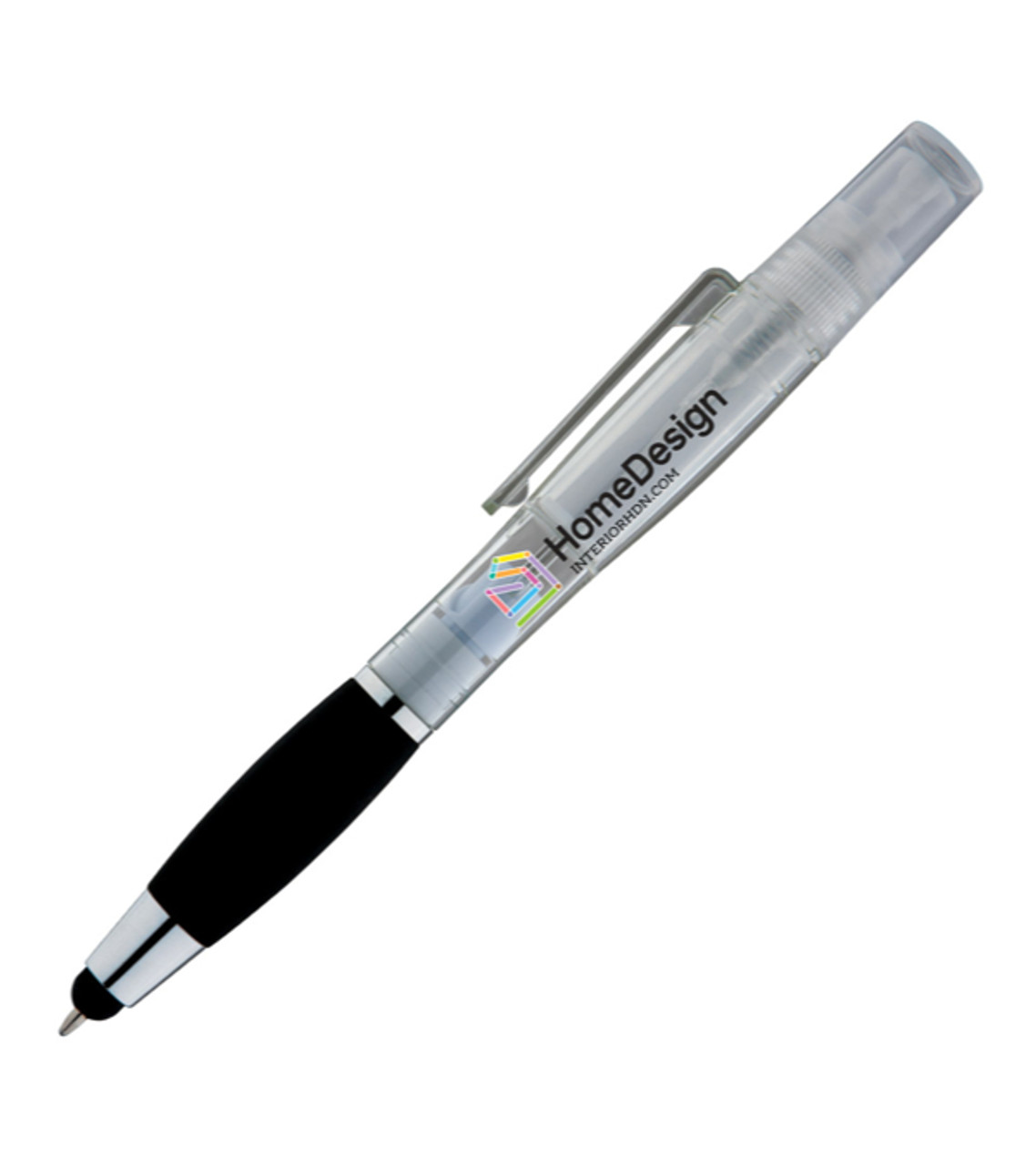 This 3-in-1 pen is ideal in these unique times. It’s a smooth ballpoint pen for writing, a stylus to help users avoid direct contact with touchscreens, and a conveniently portable hand sanitizer dispenser all in one. The pen comes empty so users can add their own gel or liquid hand sanitizer; this allows customers to stick to their preferred brand or use homemade sanitizers for even greater peace of mind. We’ll add your imprint and this pen becomes a powerful marketing gift for any business. 3-in-1 Ballpoint pen, stylus, and hand sanitizer dispener Twist-action retractable ballpoint Refillable hand sanitizer compartment comes empty 0.1fl oz (3ml) capacity Spray nozzle for easy use Can be used with both liquid and gel sanitizers Convenient carrying clip Full-color digital decoration Item size: 6″ H Imprint area: Barrel Front/Back: 1.5″W x 0.25″ H (full color) Imprint: Barrel Front/Back: 2 lines / 22 characters per line Imprint charges: $30.95 set up charge