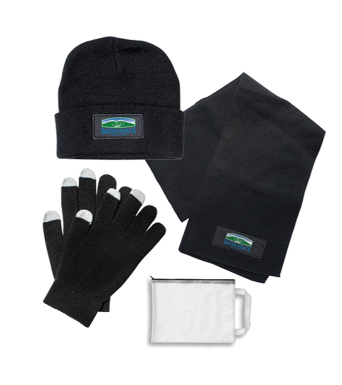Whether you’re in the winter sports business or your brand focuses on accessories, this gift will get your vibrant full-color imprint noticed. It features a hat, scarf, and a pair of touchscreen gloves, plus a handy storage bag. Offer this set at trade shows and sporting events to show people that your brand is customer-centered. Knit scarf, gloves, and hat packed in plastic accessory bag Conductive fingertips on gloves to operate tech-device touchscreens Hand wash only Digital full-color decoration (hat and scarf only; bag and gloves cannot be decorated) Item size: One Size Fits Most Adults; Hat:7.5″ W x 7.5″ H; Scarf: 10″ W x 66″ H; Gloves: 8″ W x 3.75″ H; Pouch: 13″ W x 9.5″ H Imprint area: Front of Hat on Patch: 2.625″ W x 1.125″ H (full color) / Front of Scarf on Patch: 4.5″ W x 1.375″ H (full color) Imprint: Front of Hat: 4 lines / 26 characters per line Front of Scarf: 4 lines / 34 characters per line Applicable charges: $95.00 set up charge