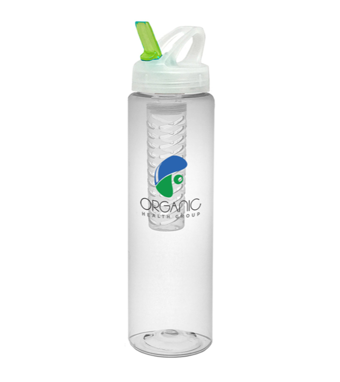 This bottle features an infuser to enhance your customers’ beverages, and a full-color imprint to enhance your branding! Customers can add fruits, herbs or other taste-enhancers to the removable infuser for a splash of natural flavor. Constructed of durable, BPA-free PET plastic Features a screw-on lid, flip-up leak-resistant drinking spout, and easy-carry handle Lid design lets you easily carry bottle with one finger Use the infuser chamber to enhance your beverage, or remove it to use as a stand-alone water bottle 12 oz. and 24 oz. measurement markers on the side make hydration tracking easier Recylable for a greener impact (recycle code 1) Proudly made in the USA Full-color digital decoration Item size:32 oz., 9.75″ H Imprint area: Front: 3.5″ W x 4.5″ H (full color) Imprint: Front: 6 lines / 22 characters per line Applicable charges: $56.00 set up charge