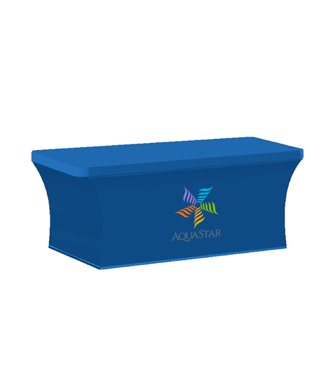 Stretch 4-sided table covers made of premium 180 gram elastic polyester that is flame-retardant and finished with a clean, full hem ensuring a professional look that will not fray after normal use and care. OPEN BACK table covers available at same pricing- must mention OPEN BACK on purchase order. Table covers are individually packaged in a clear, zippered reusable bag. All table covers fit 30″ deep tables. Complies with Prop 65. 4-sided table cover made of 180 gram elastic Polyester Designed for use with 6 ft. long tables Individually packaged in a clear, zippered reusable bag Wrinkle-resistant and flame-retardant. All table covers fit 30″ deep tables. Full color dye sublimation decoration Item size: 110″ W x 79″ H Imprint area: Side 1: 48″ W x 21″ H (full color) Imprint: Side 1: 10 lines / 60 characters per line Applicable charges: $60.00 set up charge