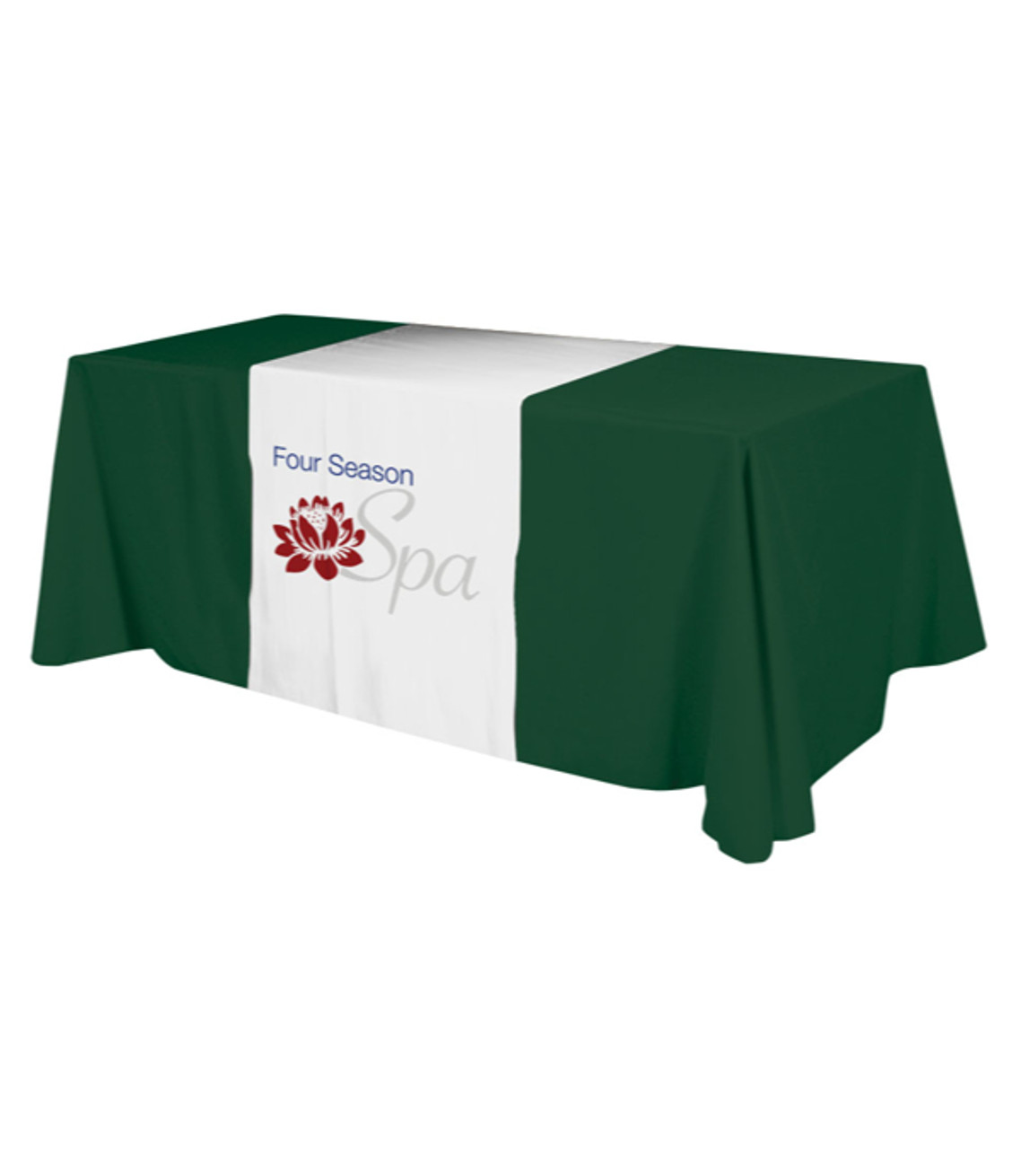 Full of boldness, your brand is sure to allure clients to it at the next trade show! With our custom full color 72″ table runner, you’ll be able to easy attract customers. Table runner drapes the top and 18″ in front of a table. Finished with a rolled hem and safety surged seams that won’t fray. Drape the top of a table, top and front, or have the runner go on the top, front and back of a table. Made of 100% Polyester; Flame retardant NFPA 701 Standard Machine washable Includes 19 W x 15 H storage bag Made in the USA with over 50% US parts. USA Made with Imported Fabric Item size: 28″ W x 72″ H Imprint area: Allow 1″ bleed on all sides; 30″ W x 74″ H (full color) Imprint: 12 lines / 24 characters per line Applicable charges: $80 set up charge