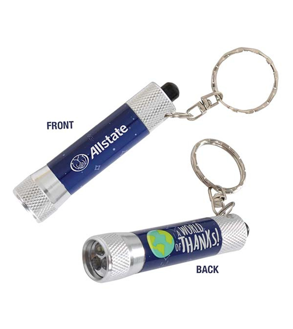 Show customers your appreciation with the World of Thanks 3 LED Flashlight Keyring. Modern and unique, it has three bright LED bulbs to shine light when needed, a key ring attachment for convenient portability, and an eye-catching message of thanks along the barrel. Add your custom imprint and it’s a highly impactful business gift any day. We can even have it ready to SHIP WITHIN 24 HOURS! Lightweight aluminum design 3 LED bulbs Split key ring attachment On/Off button Laser engraved for a permanent impression  24 HOUR RUSH processing available   24-Hour Rush: Price includes one color/one location only. Ships Next Day (Valid on select products only, pending art and credit approval). Art proof will be sent via email, so check your inbox immediately. An additional $25 fee will apply and will be included inthe set up charge. Orders must be received by 12PM EST. Artwork must be approved by 3PM EST, Monday-Friday (holidays excluded). Rush charge applies to service and production time only; please allow additional time for your choice of delivery method. Maximum Quantity: 2,500 pieces. If you need more, please call for availability. Item size: 2 3/5″ H Imprint area: Front: 1 1/4″ W x 1/4″ H (1 color max.) Imprint: Front: 3 lines / 24 characters per line Applicable charges: $24.95 set up charge