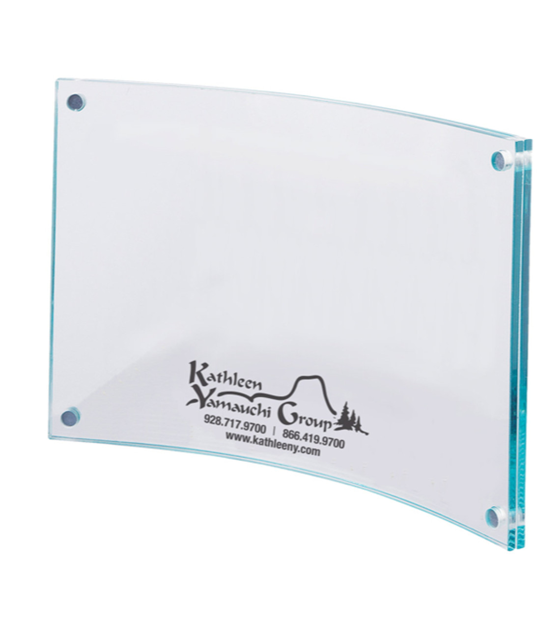 Stay ahead of the curve with this transparent acrylic, custom frame designed to gently curve and sit upright on any flat surface. This promotional frame magnetically holds up to two photos to prevent damage, and with a dual side view, recipients are able to display two of their favorite photos at once. Magnets in each corner make changing photos a snap! Acrylic photo frame Holds 4×6 photos or messages Pad printed decoration Item size: 6″ W x 4″ H x 0.25″ D Imprint area: 3″ W x 1″ H (1 color max.) Imprint: 4 lines / 20 characters per line Applicable charges: $60.00 set up charge