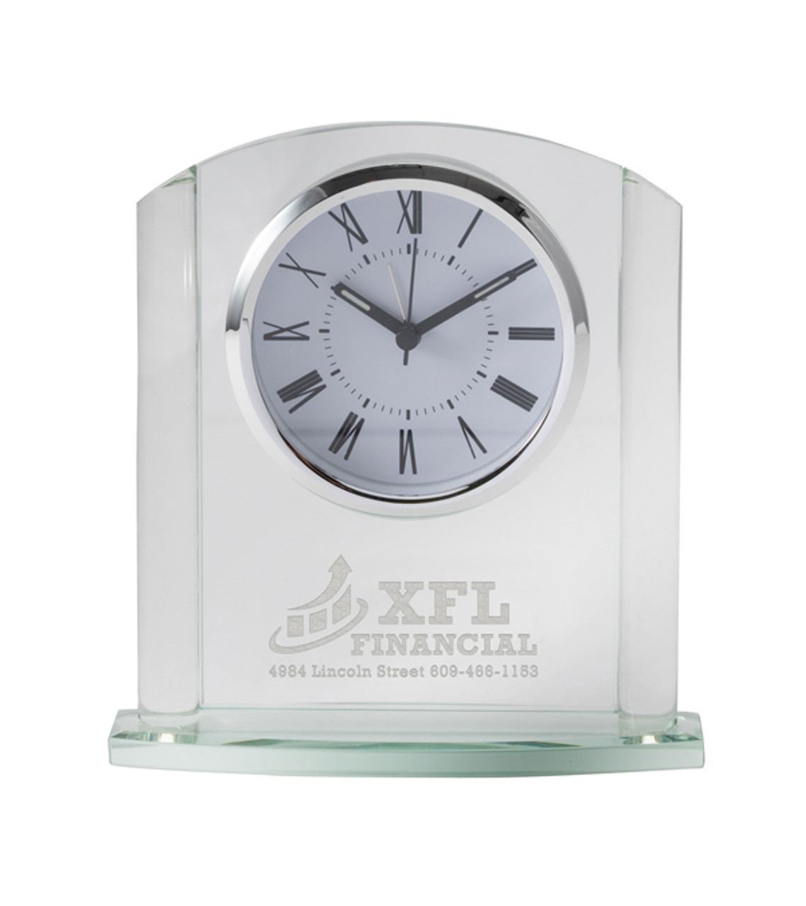 Elevate Your Brand with Timeless Elegance our Classic Glass Clock. The perfect blend of sophistication and functionality, designed to leave a lasting impression. Crafted from high-quality glass Built-in alarm feature The silver dial adds a touch of luxury Comes with a AA battery included Precise laser engraving service Item size: 6 1/4″ W x 1 3/4″ H Imprint area: Front: 3 1/2″ W x 1 1/2″ H Imprint: Front: 10 lines / 60 characters per line Applicable charges: $60.00 set up charge