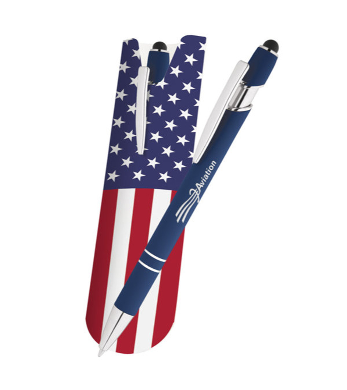 Keep your brand in front of customers with our Arden Soft Touch Stylus Pen. It has stylish chrome accents, a click-action ballpoint for easy one-handed, use and a built-in touchscreen stylus compatible with any smartphone or tablet. This is a great way to add value to customers’ daily lives. We’ll even add a patriotic pen sleeve to make your gift complete. Metal ballpoint pen with soft-touch finish Click-action mechanics Rubber touchscreen stylus at end Handy carrying clip Medium ballpoint tip German technology ink Free pen sleeve included Laser engraved so your imprint won’t rub off or fade Item size: 5.624″ H Imprint area: Barrel Front: 2.12″ W x 0.2″ H / Barrel Back: 2.12″ W x 0.2″ H Imprint: Barrel Front, Barrel Back: 2 lines / 30 characters per line Imprint charges: $24.95 set up charge
