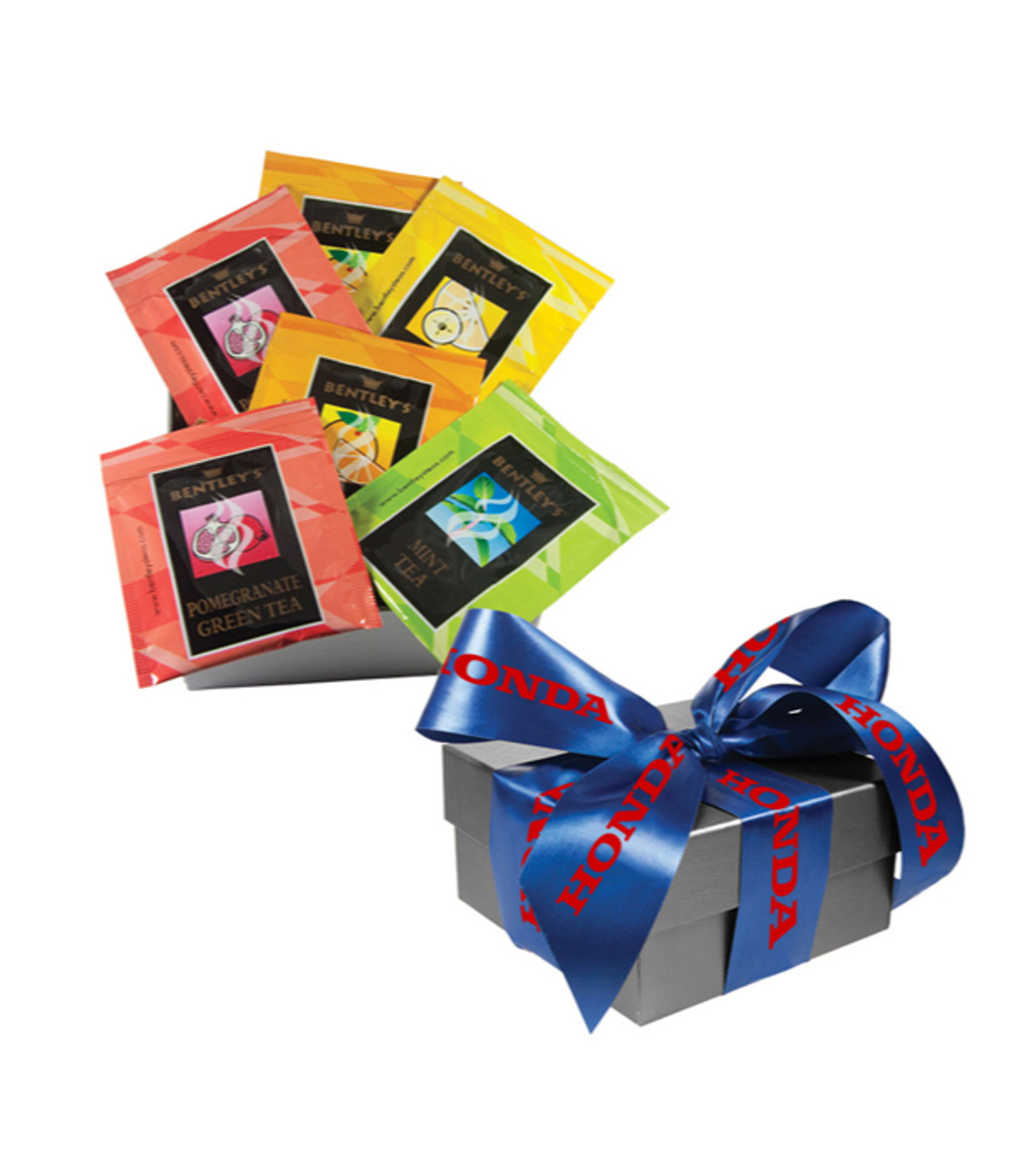 A silver box, beautiful ribbon, and six gourmet tea bags combine to make this one delectable giveaway. We’ll hot-stamp your name onto the ribbon for a finishing touch that proves your business doesn’t skimp when it comes to quality. Silver Cardstock box Includes six gourmet tea bags Tea bag flavors include: Orange Spice, Lemon, Mint, and Pomegranate Ribbon Made in USA Hot-stamped decoration Item size: 4″ W x 2″ H x 4″ D Imprint area: Ribbon: 4″ W x 1″ H (full color) Imprint: Ribbon: 4 lines / 12 characters per line Applicable charges: $60.00 set up charge