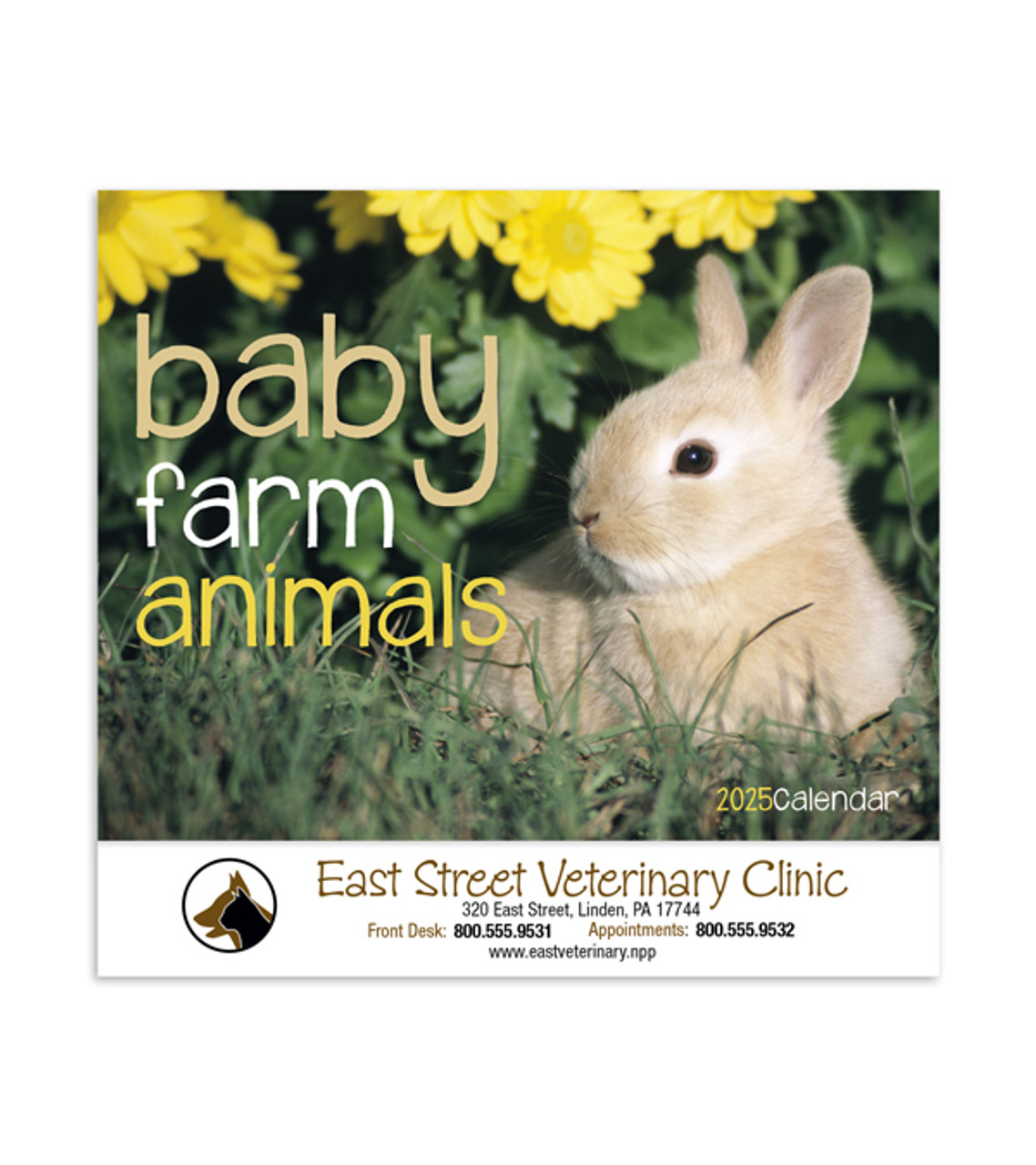 Get noticed every day with the Baby Farm Animals Wall Calendar! It features thirteen photos of cute and cuddly barnyard animals printed on gloss paper stock with a quality UV coating on the cover. Give it to customers and prospects to keep your brand on their minds all year. Gloss paper stock with UV coated cover 13 month calendar High-quality imagery Made in USA Full-color digital decoration Item size: 11″ W x 10″ H Imprint area: Front: 9″ W x 1.25″ H (full color) Imprint: Front: 4 lines / 55 characters per line Imprint charges: $14.95 set up charge