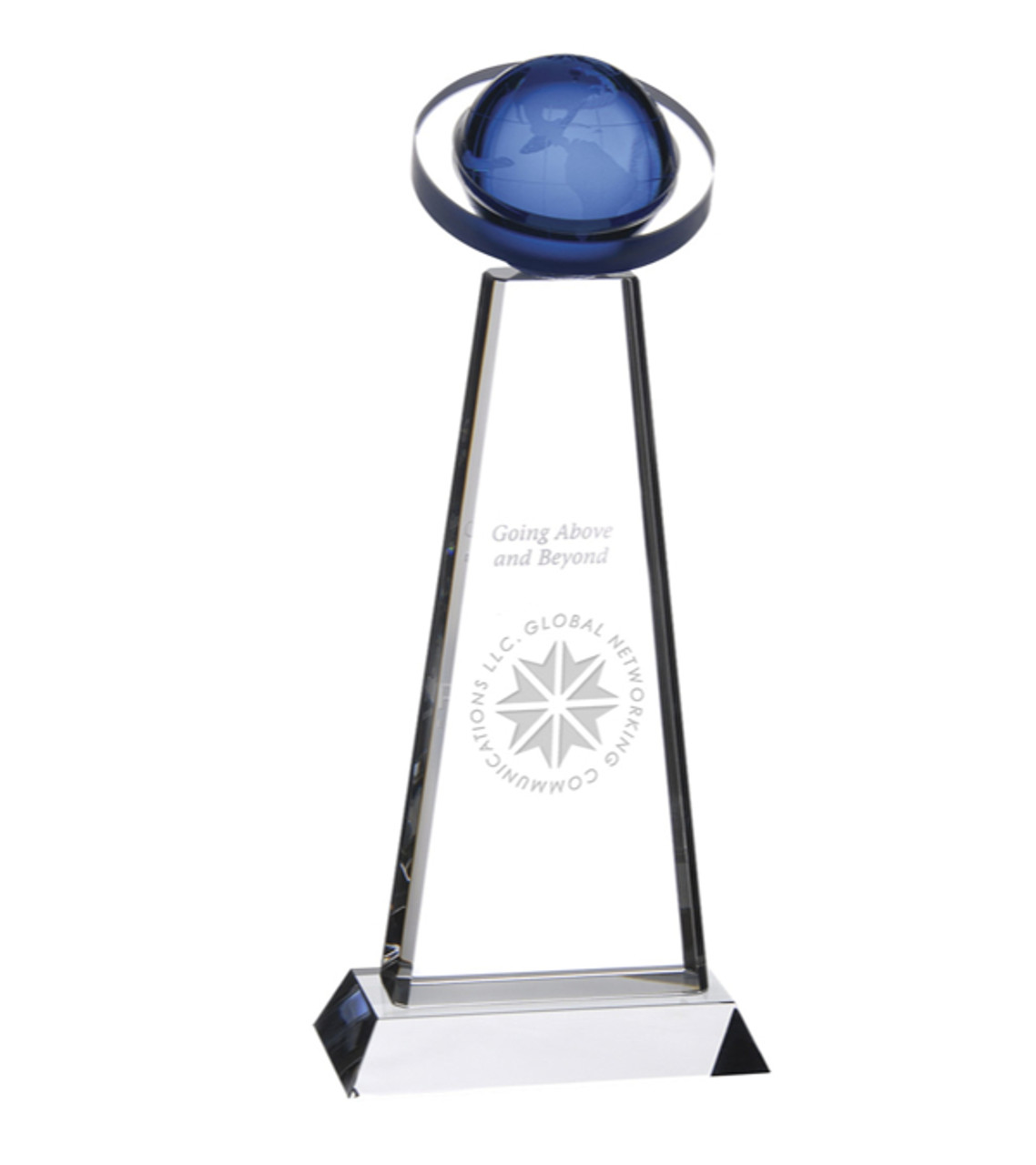 Unique in geometric design and exquisite color, our custom blue orb company award is perfect for expanding global companies focused on creating global partnerships. A beautifully crafted recognition award they will be proud to receive and exhibit for years to come. Award made of Optical Crystal Deep etched decoration Item size: 5.75″ W x 11″ H x 3″ D Imprint area: Back: 2″ W x 5″ H Imprint: Back: 8 lines / 16 characters per line Applicable charges: $60.00 set up charge