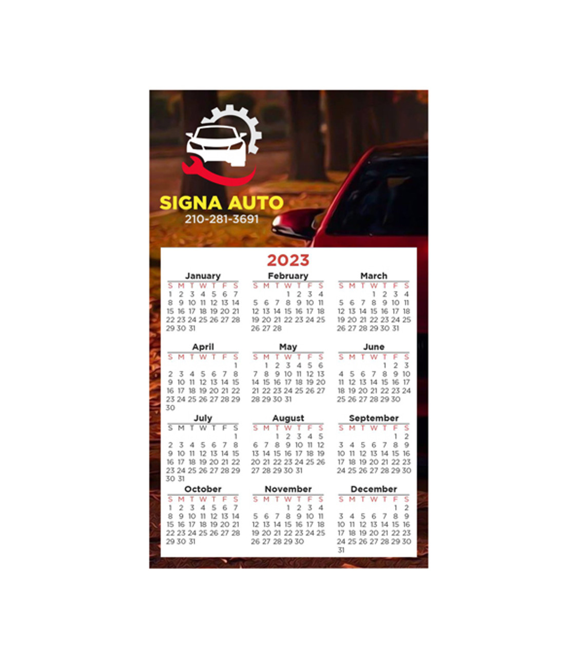 The Calendar Magnet is a practical gift that shows the full year in one glance and keeps your custom imprint visible. Hand it out at events, give it to customers as a thank-you, or send it out in mailers to help promote your business. It will be mounted to refrigerators, filing cabinets, and more to help them remember your name. .20 mil thickness Made in USA Ideal for mailers, trade shows, fairs and more Easily mounts to metal surfaces Full color digital decoration Item size: 3.5″ W x 6″ H Imprint area: Front: 3.5″ H x 6″ W (full color) Imprint: Front: 10 lines / 36 characters per line Imprint charges: FREE set up