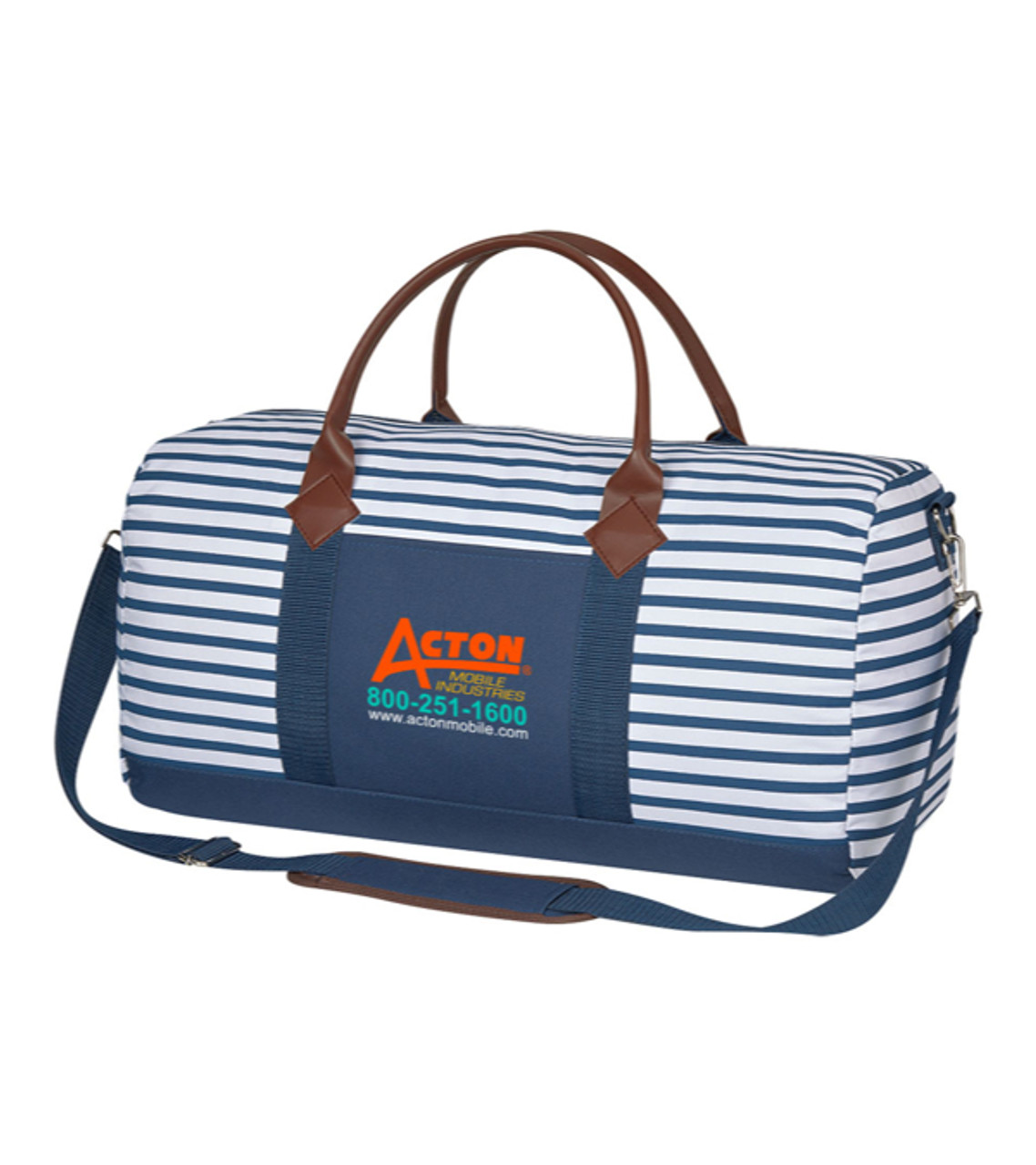 Help your brand name travel with the Cambridge Weekender Duffel Bag. Its a great looking bag made of durable polyester with leatherlike accents. Customers will appreciate the roomy main compartment when heading off for business trips and weekend getaways. 600D Polyester with 190D lining Leatherette carrying handles and accents Zippered main compartment Exterior front pocket Adjustable padded shoulder strap, detachable Spot clean/ Air dry Heat-transferred decoration Item size: 20″ W x 10″ H x 9″ D Imprint area: Pocket: 5″ W x 5″ H (4 colors max.) Imprint: Pocket: 10 lines / 18 characters per line Applicable charges: $60.00 set up charge $0.50 per pc per additional color