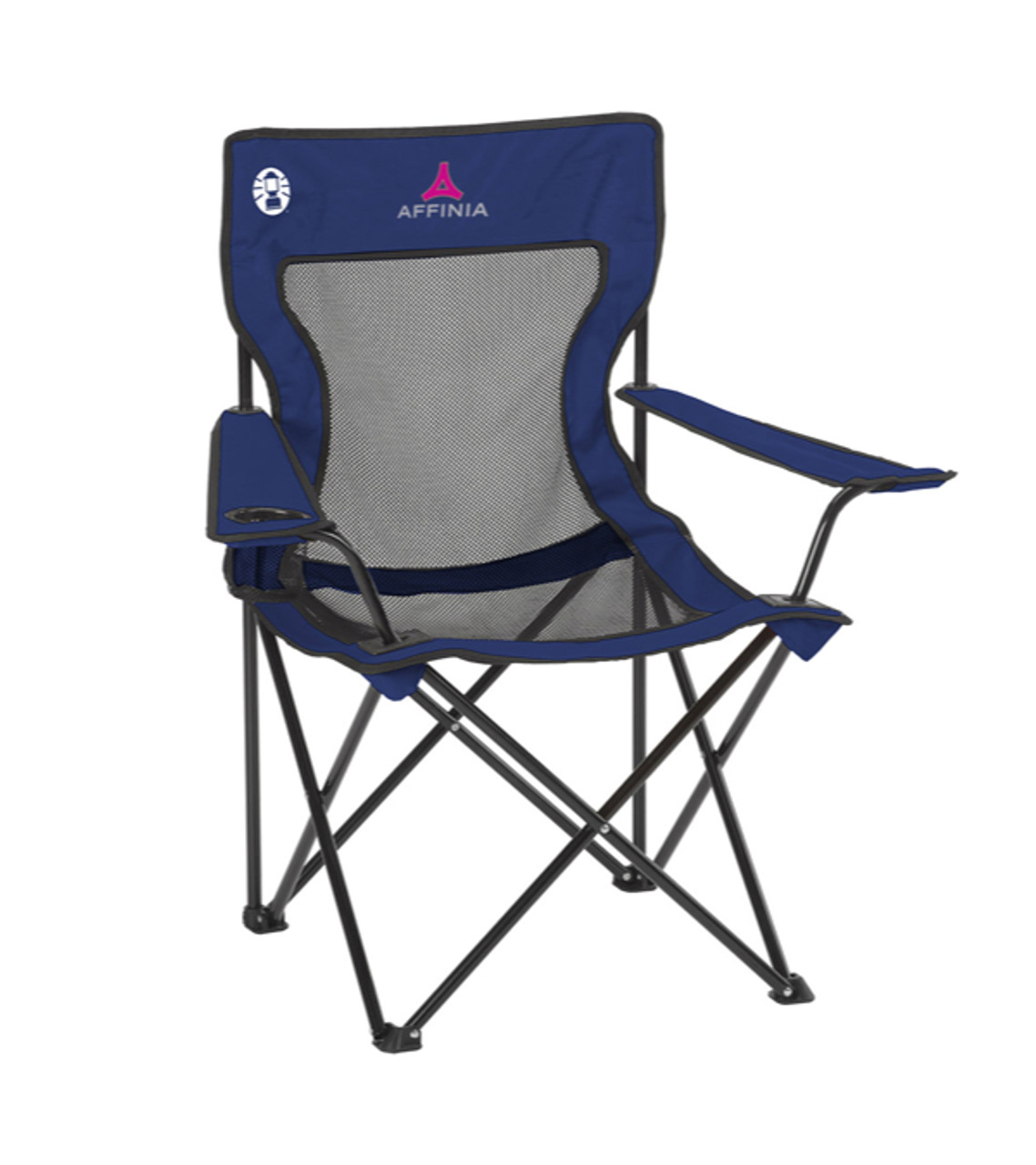 Custom poly-oxford mesh Coleman chair with mesh cup holder holds your drink for convenience so you can relax effortlessly. Made of Poly-Oxford with Steel frame Supports up to 250 lbs Adjustable carry strap One year warranty guaranteed. Heat transferred decoration Item size: 29″ W x 35.75″ H x 21.25″ D Imprint area: Front: 7.5″ W x 4″ H (2 colors max.) Imprint: Front: 4 lines / 18 characters per line Applicable charges: $60.00 set up charge per color $0.65 per pc per additional color