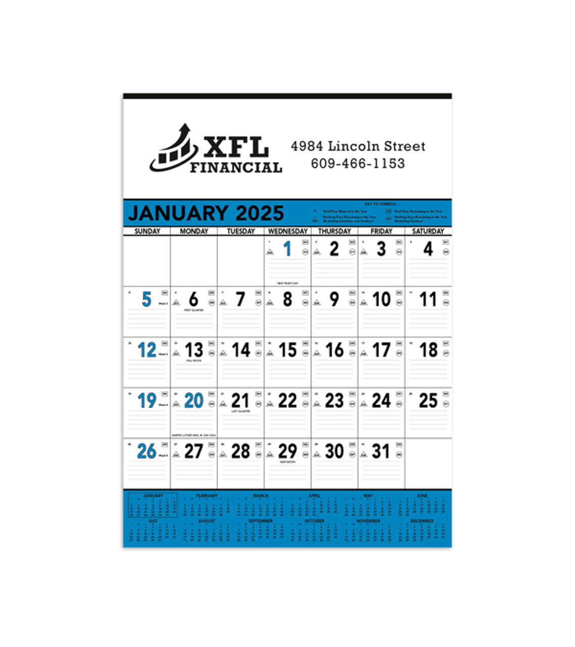 The Contractor Calendar will help you stay connected to customers and employees all year long. It helps users keep track of how many days are left in the year. With memo lines to aid in notetaking and jotting down appointments, this is a handy custom gift they’ll use every day. Goes from December to December Includes memo lines in date blocks Symbols denoting: total days elapsed in the year and remaining in the year; work days remaining without Saturdays and Sundays; work days remaining without Sundays Week numbers 12 month reference calendar at the bottom Black tin at top and hanger Made in USA FSI certified (materials used for this product have been responsibly sourced) Offset printed Item size: 18″ W x 24.5″ H Imprint area: Top: 17″ W x 4.5″ H (1 color max.) Imprint: Top: 10 lines / 60 characters per line Imprint charges: FREE set up
