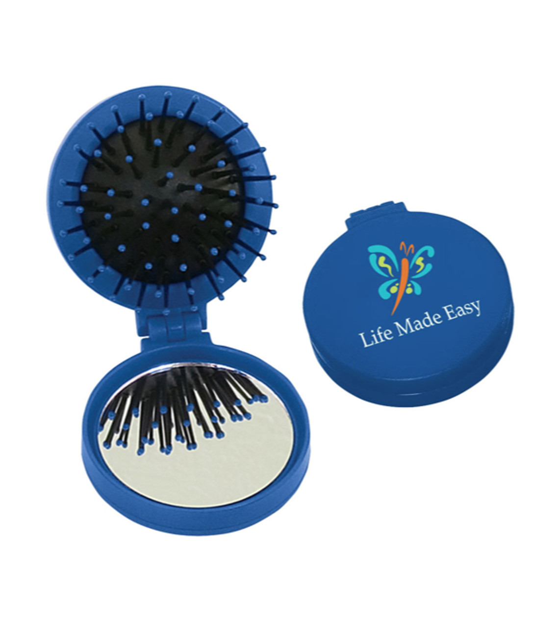 Travel lighter with this compact 2-in-1 kit. High-impact round plastic case includes a pop-out hairbrush with plastic bristles plus a shatter-resistant mirror. Convenient and compact, this kit will be appreciated by all! Item size: 2.25″ Dia. Imprint area: Top: 2″ Dia. Imprint: Top: 6 lines / 22 characters per line Applicable charges: $60.00 set up charge (full color imprint) $0.30 run charge per piece