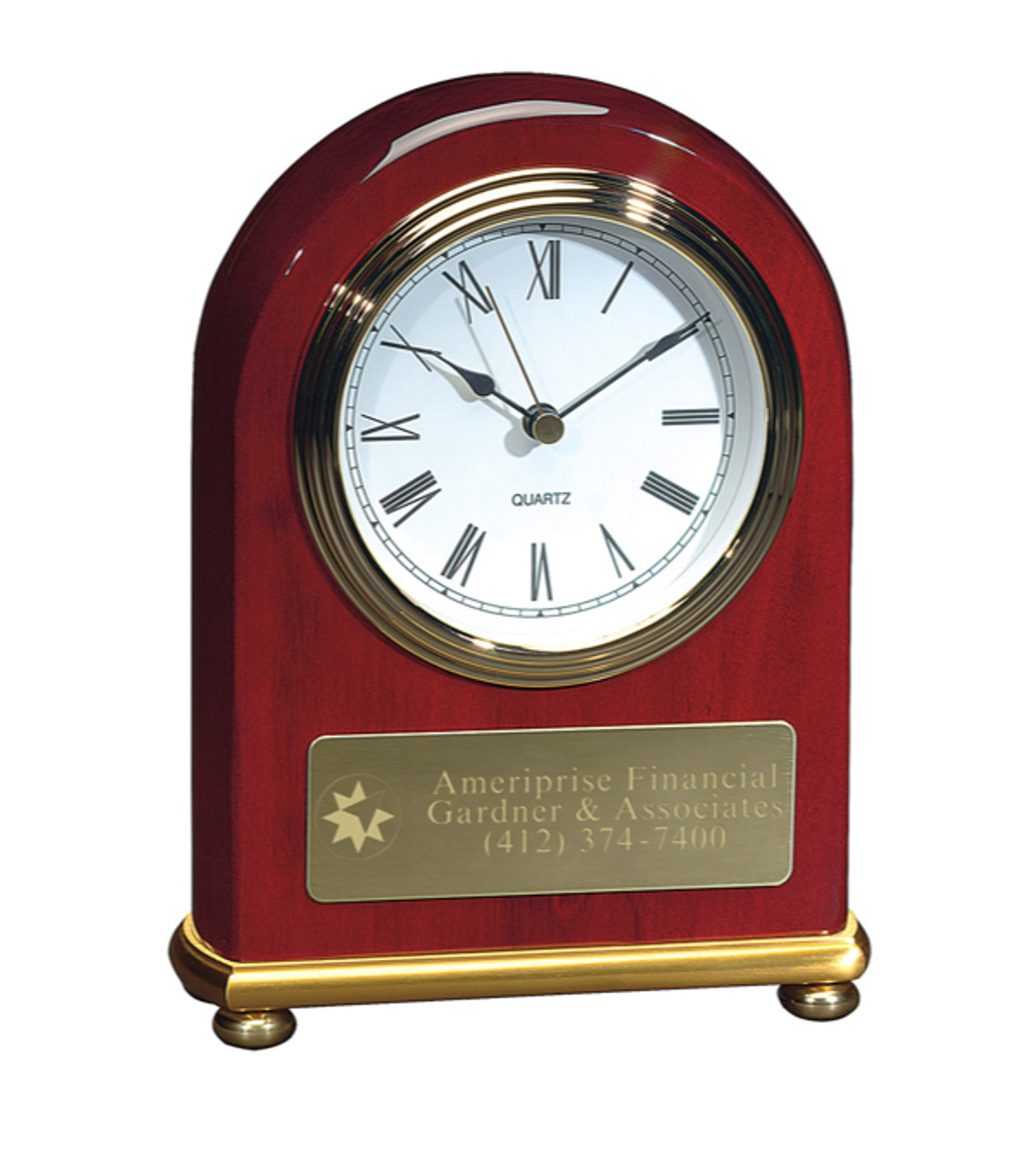 It’s “time” to show recognition for hard work! This customized rosewood clock features a traditional arch design and brass bezel. Plaque made of natural metal provides a great imprint space for a personal message or company logo. Elegant arch clock made of Rosewood with Brass bezel AA Batteries included Laser engraved decoration Item size: 5″ W x 6.75″ H x 1.875″ D Imprint area: 3.25″ W x 1″ H Imprint: 4 lines / 22 characters per line Applicable charges: $60.00 set up charge