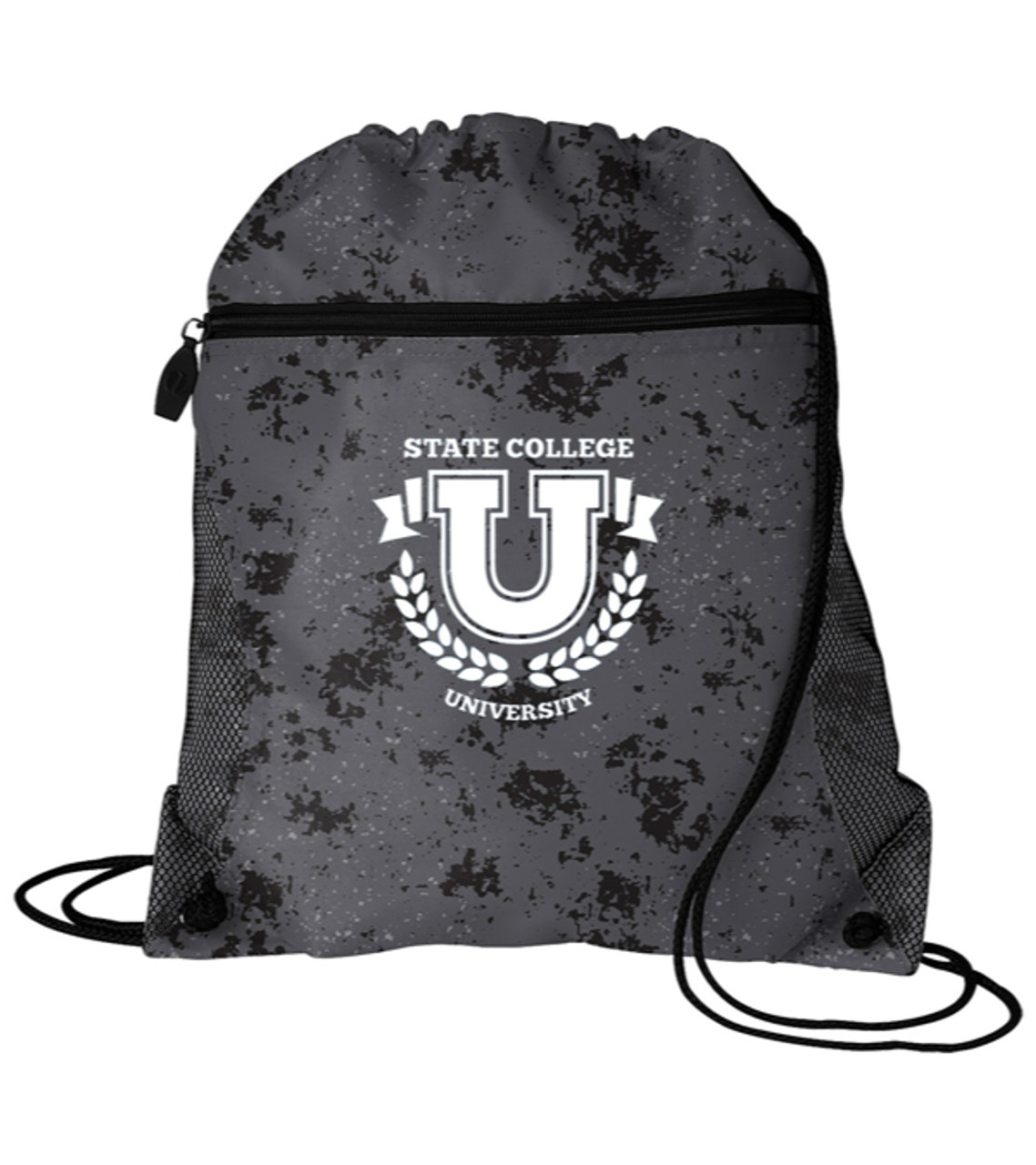 With a stylish design and a secure drawstring closure, the Distressed Printed Mesh Pocket Drawcord backpack is an ideal giveaway at educational or athletic events. Your brand name will get more attention–and compliments too–whenever customers carry this gift. 210D Polyester Double drawcord closure Zippered outer pocket Mesh accent Reinforced corners Screen-printed decoration Item size: 14″ W x 16.5″ H Imprint area: Front : 7″ W x 7.5″ H (1 color max.) Imprint: Front : 10 lines / 28 characters per line Applicable charges: $60.00 set up charge