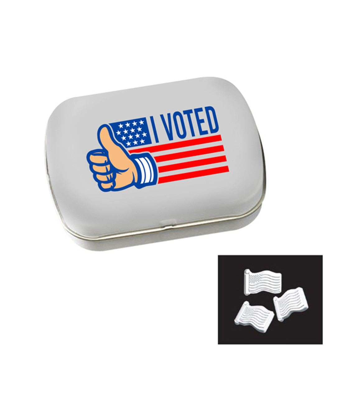 Patriotic promo! Create photo quality, full color imprints on our tin! Not only will the recipient think of your company each time they reach for a MicroMint®, they are guaranteed to find a use for it once the mints have been enjoyed. It’s a little keepsake, sized right to hold on to all kinds of things keeping your logo and message top of mind! Peppermint will be provided unless specified otherwise. Tin filled with American flag shaped MicroMint® Full color digital decoration Item size: 2.375″ W x 1.875″ H x 0.625″ D Imprint area: Front: 1.75″ W x 1.374″ H (full color) Imprint: Front: 10 lines / 32 characters per line Applicable charges: $60.00 set up charge