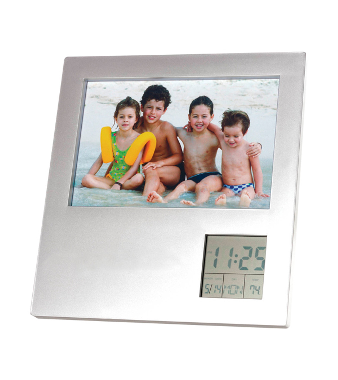 Thank your clients time after time with the custom dual position frame. This 2 in 1 promotional frame includes a swiveling clock movement to allow a convenient repositioning option from portrait to landscape format. Designed to fit a 4″ x 6″ picture and the digital display showcases the time with alarm, date, day, and temperature. Durable ABS Plastic construction Frame holds one 4×6 photo Uses 2 AA batteries (included) Multi-function display Display stand in back Pad printed decoration Item size: 7.25″ W x 7.5″ H x 0.75″ D Imprint area: 2″ W x 2″ H (1 color max.) Imprint: 5 lines / 18 characters per line Applicable charges: $60.00 set up charge