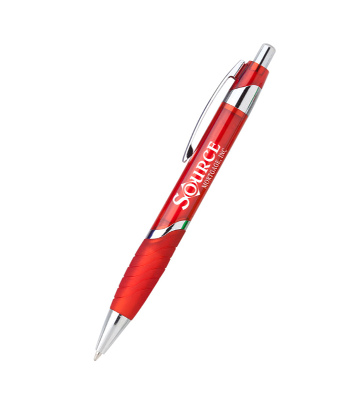 This pen doesn’t just look great in hand, it feels great too. Designed with a translucent barrel, sleek chrome accents, and a ridged grip, it’s the perfect way to showcase your brand logo every day.  Click-action retractable ballpoint Chrome accents Ridged grip Screen printed decoration Item size: 5.38″ H Imprint area: Wraparound: 1.625″ W x 0.625″ H (1 color max.) Imprint: Wraparound: 4 lines / 35 characters per line Imprint charges: $24.95 set up charge