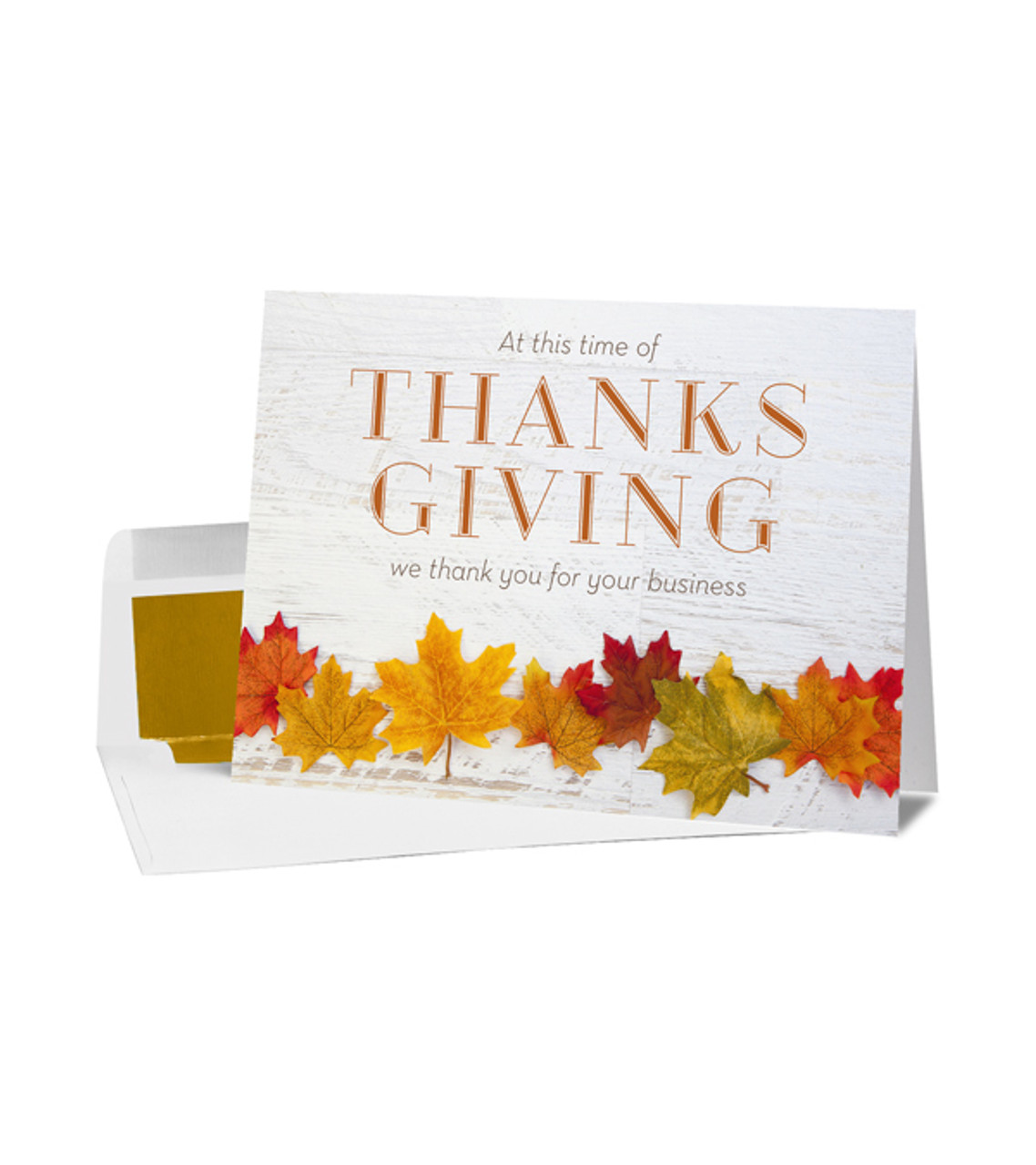 This Thanksgiving, make a memorable impression with our elegant and thoughtfully designed Thanksgiving Card. Perfect for expressing your gratitude and strengthening professional relationships, this card is a gesture of appreciation that will be cherished. Paper card Includes choice of greetings Standard foil-lined envelopes Foil stamped decoration Item size: 7.875″ W x 5.63″ H Imprint area: Card Inside: 1.5″ W x 1.5″ H (1 color max.) / Envelope: 1.06″ W x 0.17″ H (1 color max.) Imprint: Card Inside: 5 lines / 37 characters per line Envelope: 3 lines / 32 characters per line Applicable charges: $24.95 set up charge $24.95 return address on envelope $0.10 per pc