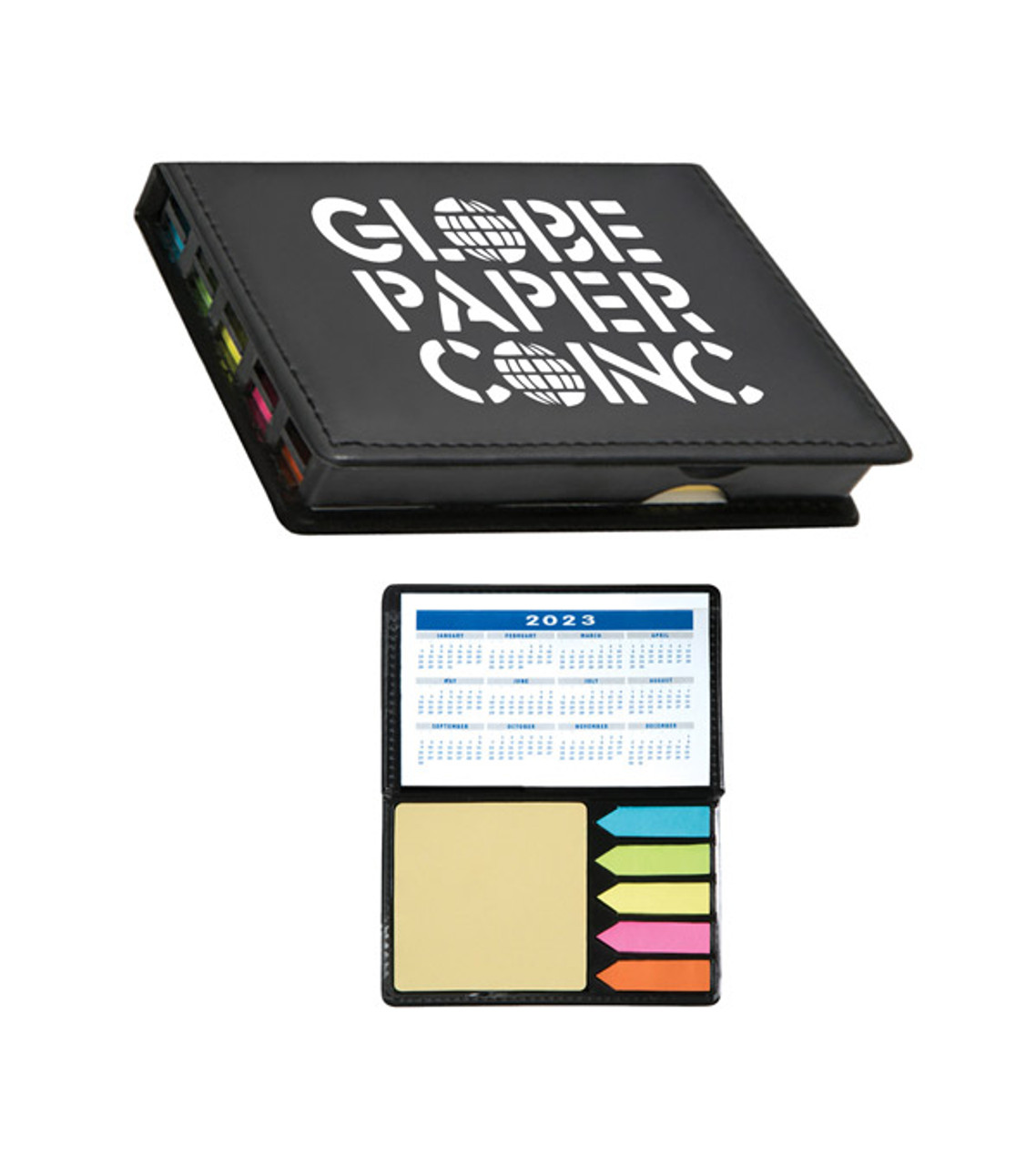 Help customers and employees stay organized with this gift. The reversible calendar cards span four years; and the double-sided holder contains two sticky notepads and two sets of colored, sticky, page markers. Add your imprint and this is a wonderful handout at trade shows or within your office. Vinyl, double-sided holder Includes reversible calendar cards that span four years On one side, holder contains: Square, yellow sticky pad (40 sheets); 5 colored, sticky markers (40 sheets each) On the other side, holder contains: Square, white sticky pad (40 sheets); 5 colored, sticky markers (40 sheets each) Hot stamped decoration Item size: 5.11″ W x 3.34″ H x 0.79″ D Imprint area: Front/Back: 3.5″ W x 2″ H (1 color max.) Imprint: Front/Back: 8 lines / 30 characters per line Imprint charges: $24.95 set up charge $0.15 per pc per additional location