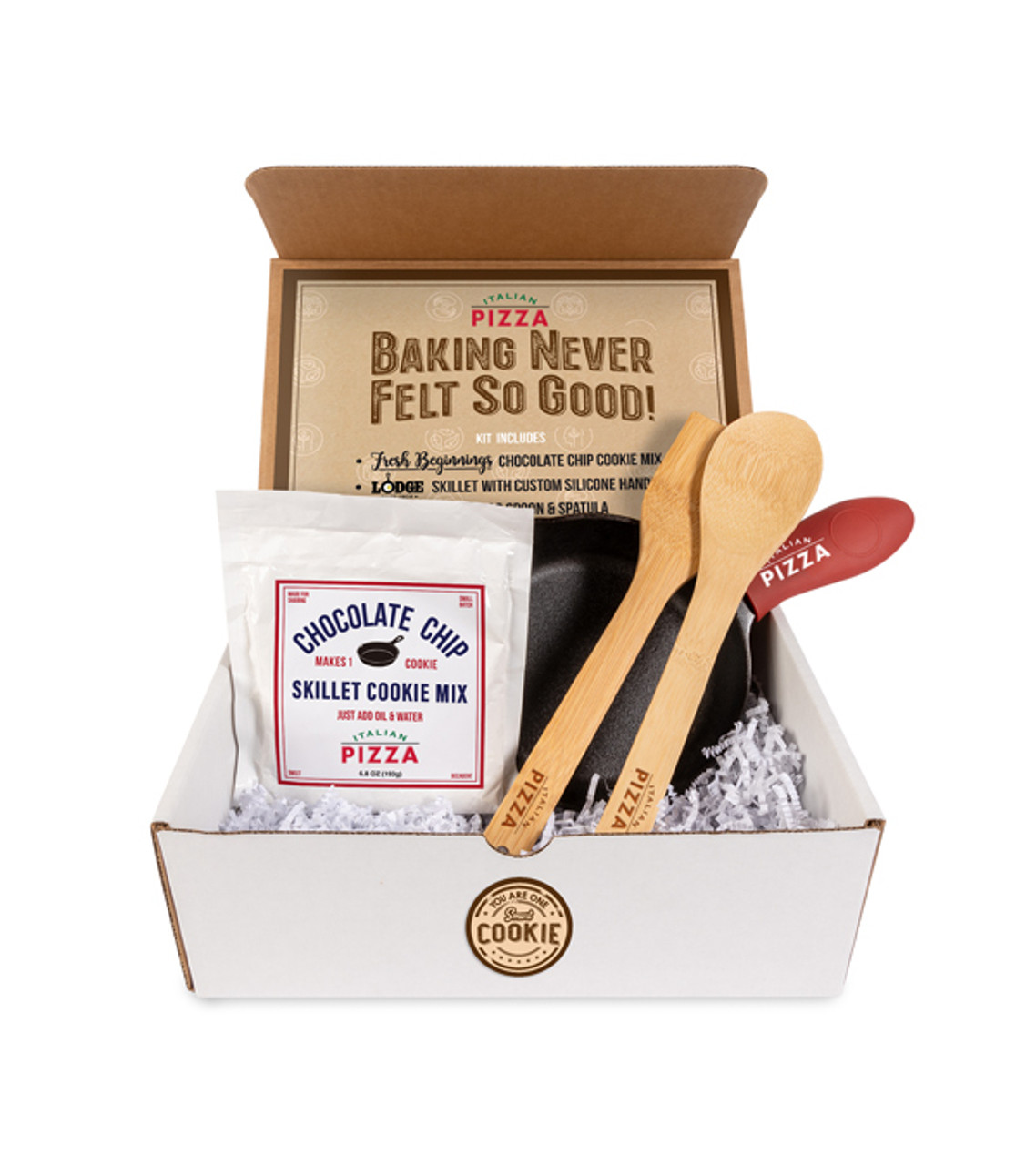 Bake up the perfect holiday treat with our Lodge skillet cookie set featuring a 6.5″ Lodge skillet with 6.8 oz Fresh Beginnings chocolate chip cookie mix and a silicone sleeve handle with 1 color imprint. Cookie mix makes 1 large chocolate chip cookie. Eco-friendly bamboo utensil set features a custom spatula and spoon. Add your logo on the inside label for the perfect presentation! Mix Shelf life 1 year. Add butter and milk per instructions. Cast Iron Skillet and utensils hand wash only. Item size: 8″ W x 4″ H x 11″ L Imprint area: Inner Label: 5.5″ W x 1″ H (full color) Silicone Handle: 1.5″ W x 1″ H (1 color max.) Cookie Mix Label: 1.8″ W x 0.7″ H (full color) Spoon: 3.5″ W x 0.5″ H Spatula: 3.5″ W x 0.5″ H Skillet box: 6″ W x 1.8″ H (full color) Imprint: Inner Label: 10 lines / 60 characters per line Silicone Handle: 8 lines / 24 characters per line Cookie Mix Label: 6 lines / 32 characters per line Spoon: 4 lines / 60 characters per line Spatula: 4 lines / 60 characters per line Skillet box: 10 lines / 60 characters per line Applicable charges: $155.00 set up charge