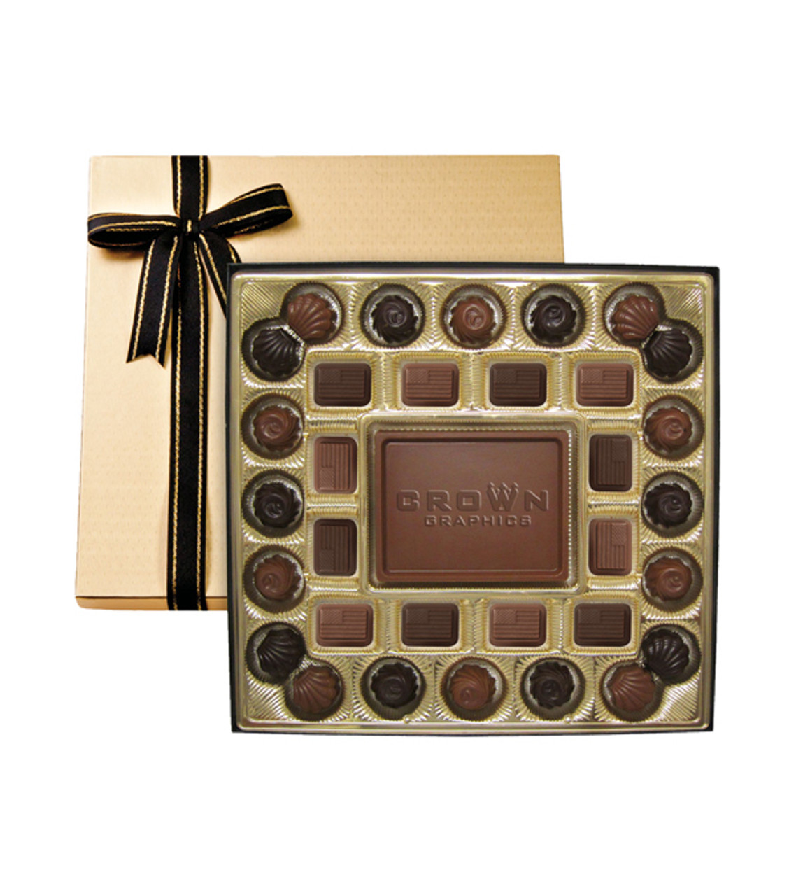 An emblem of appreciation, our promotional Custom Flag Gift Box is a delicious way to show appreciation year-round. Perfect for sharing, or for just one, our gift box contains one milk or dark Swiss chocolate centerpiece, surrounded by 32 milk, dark or mixed chocolate shaped like flags. Perfect for any time of year! Item size: 11 1/4″ W x 10 3/4″ H x 1″ D Imprint area: Chocolate centerpiece: 4″ W x 3″ H Imprint: Chocolate centerpiece: 4 lines / 22 characters per line Applicable charges: $75.00 set up charge In order to ensure the highest-quality delivery of your product, we use special insulated packaging and cool packs to protect chocolate orders from heat during warm weather months and/or when shipping to warm climates. Depending on your location, 2-day shipping may be necessary to preserve the quality of the products. Additional charges will be incurred. Please contact our Customer Service team for more information.