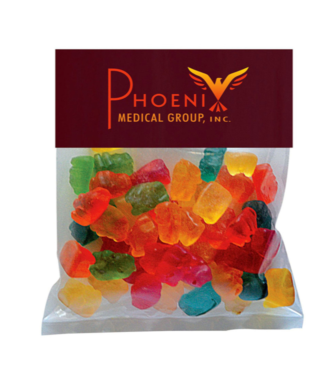 This sweet, colorful gift is sure to draw in new customers at trade shows and community events. It gives people a taste of what your brand has to offer, and keeps them wanting more. 2 oz. package of gummy bear candies Header with large area for your imprint 4-color process digital decoration Item size: 5″ W x 5″ H x 1″ D Imprint area: Front/Back: 5″ W x 3″ H (full color) Imprint: Front/Back: 10 lines / 31 characters per line Applicable charges: $60.00 set up charge During warmer weather months perishable items may require special packaging and shorter shipping transit times. Additional charges will be incurred. Please contact our Customer Service team for more information.
