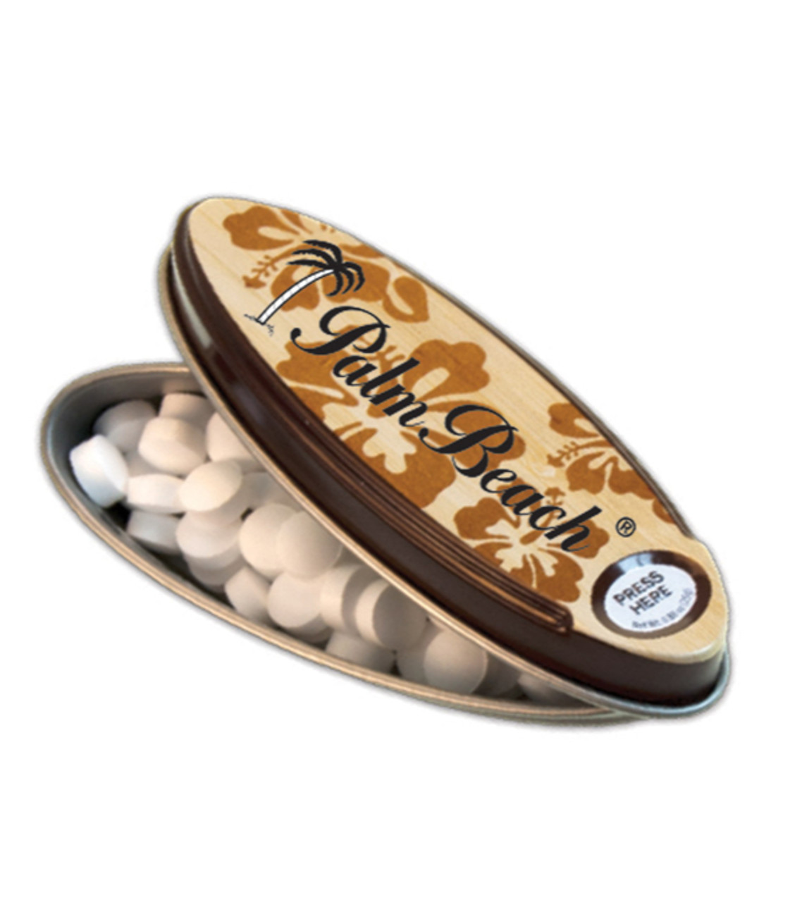 Whether you hand this container of mints directly to a customer or slip it inside a gift bag, it’s a treat that promises to make a splash. The reusable, surfboard-shaped holding tin is a lasting reminder of your thoughtfulness, and will keep customers rolling in. Tin Includes 80 mints Full color digital decoration Item size: 1.25″ W x 3.5″ H Imprint area: Front: 2.5″ W x 0.875″ H (full color) Imprint: Front: 10 lines / 14 characters per line Applicable charges: $60.00 set up charge