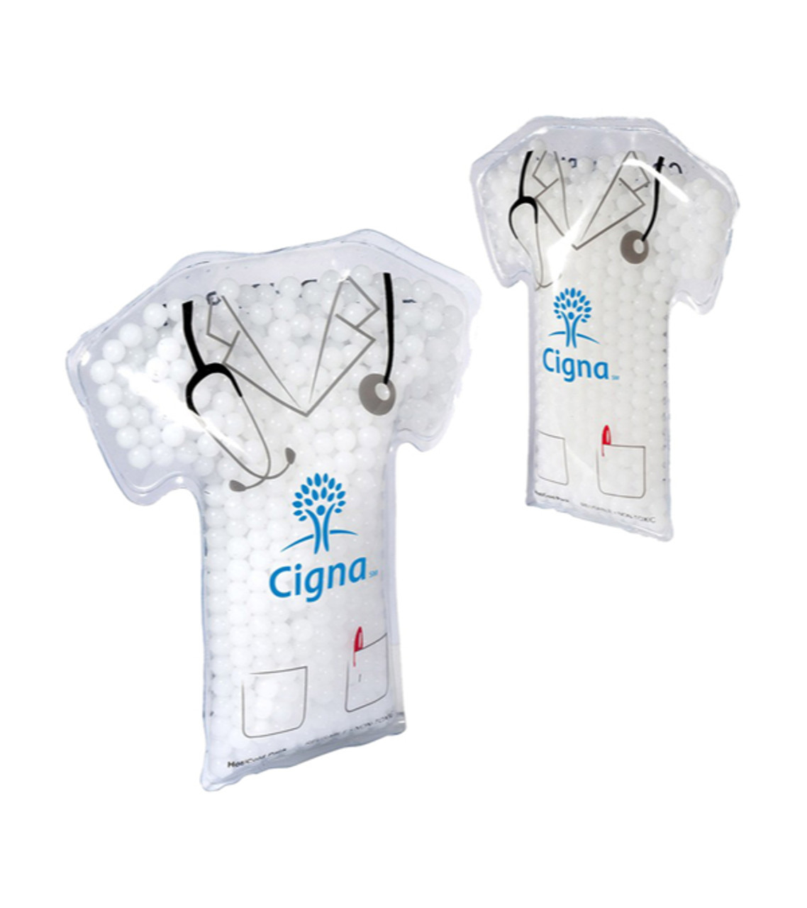 The doctor is always in with this hot & cold gel pack! It can be refrigerated, frozen or microwaved to help soothe sore muscles and body aches. The fun lab coat design makes it perfect for medical facilities and physical therapy providers. Decorate this gift and remind patients how much you care. Hot/cold pack is easy to use for temporary relief of aches and pains Refrigerator/freezer friendly and microwave safe (see instructions on back) Hand wash with soapy water and use again and again Uses aqua bead gel technology Latex-free & non-toxic for safe use Includes: water, glycerin, sodium polyacrylate Pad-printed decoration WARNING: Not intended for children under age 3 Item size: 5.25″ W x 6″ H x 0.75″ D Imprint area: Front: 1″ W x 1″ H (2 colors max.) Imprint: Front: 6 lines / 12 characters per line Applicable charges: $60.00 setup charge $0.35 per pc per add’l color