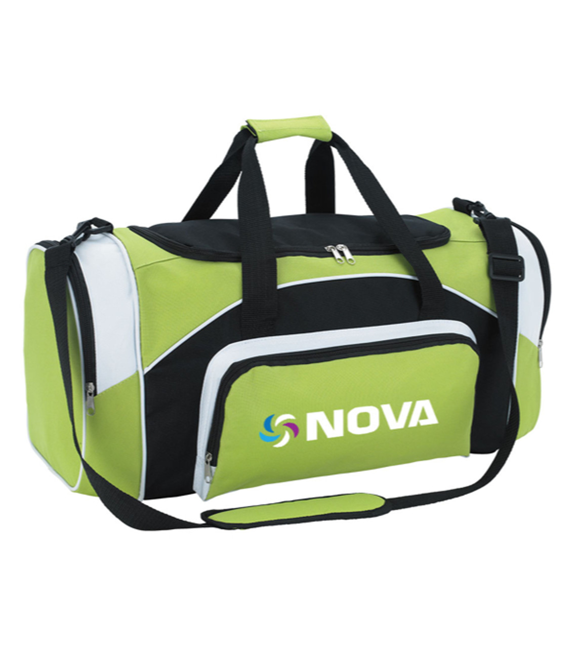 With multiple compartments and two carrying options by handle or shoulder strap this durable duffel gets the job done. It makes an awesome gift for sports teams, and a powerful membership incentive for a gym or fitness center. 600D Polyester Zippered closures Exterior front pocket and side compartments Screen-printed decoration Item size: 23.625″ W x 9.5″ H x 11.375″ D Imprint area: Front: 8.5″ W x 4″ H (4 colors max.) Imprint: Front: 4 lines / 20 characters per line Applicable charges: $60.00 set up charge per color