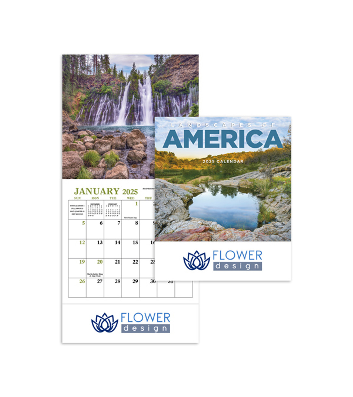 Immerse yourself in the breathtaking beauty of America’s diverse landscapes. This compact masterpiece captures the essence of the country’s scenic wonders, offering a visual journey that fits right in your pocket. 12-Month Mini Calendar Gloss Paper Stock with UV Coated Cover High-quality Imagery The FSCĀ® label means that the materials used for this product come from well-managed FSCĀ®-certified forests and other controlled sources. Full color digital decoration Item size: 5.75″ W x 6.875″ H Imprint area: Front: 5″ W x 0.75″ H (full color) Imprint: Front: 4 lines / 12 characters per line Imprint charges: $14.95 set up charge