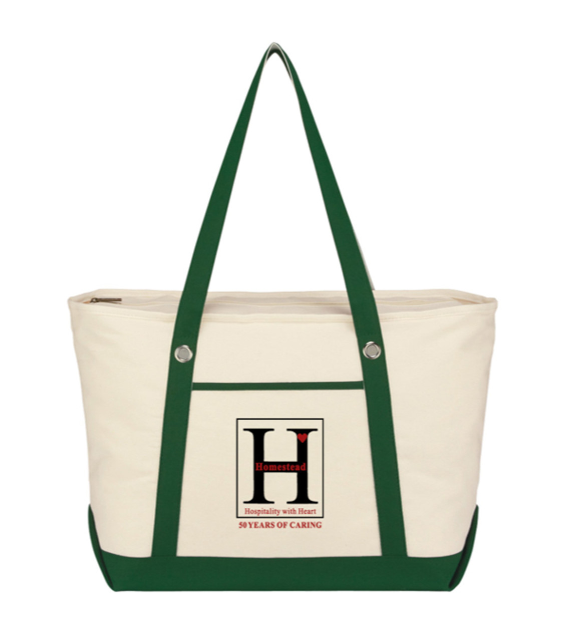 Sail away with our custom large cotton canvas sailing tote! This durable cotton canvas tote features an outside pocket, zippered top closure, and 27″” handles so it’s comfortable to carry. It’s sure to be a hit at any promotional event or customer giveaway! 12 oz. Cotton canvas Zippered main compartment Exterior slip pocket 27 Carrying handles Spot clean/ Air dry Heat-transferred decoration Item size: 23″ W x 14″ H x 7″ D Imprint area: Front: 6″ W x 6″ H (4 colors max.) Imprint: 8 lines / 24 characters per line Applicable charges: $55 set up charge $0.50 per piece per additional color