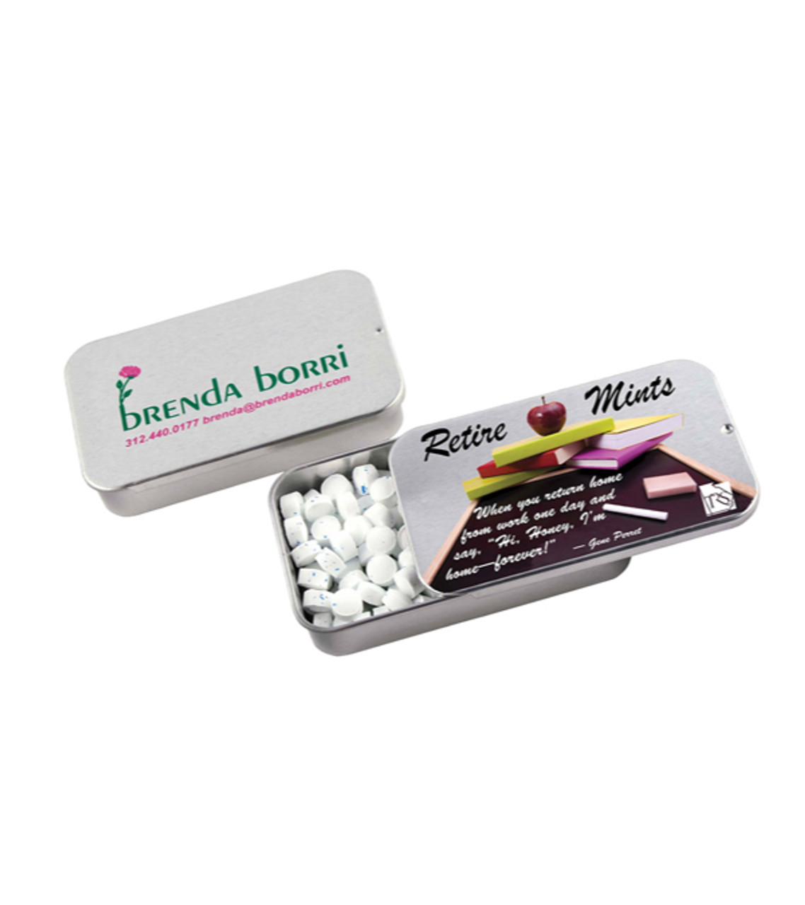 This convenient, reusable tin slides open and closed for easy access to the MicroMints® inside. Add your full-color imprint on the lid and you’ve got the ideal giveaway for trade shows and fairs. Tin Filled with MicroMints® Non-melt product Made in USA Full color digital decoration Item size: 1.8125″ W x 3″ H x 0.5″ D Imprint area: Top: 2.25″ W x 1.3125″ H (full color) Imprint: Top: 5 lines / 20 characters per line Applicable charges: $60.00 set up charge