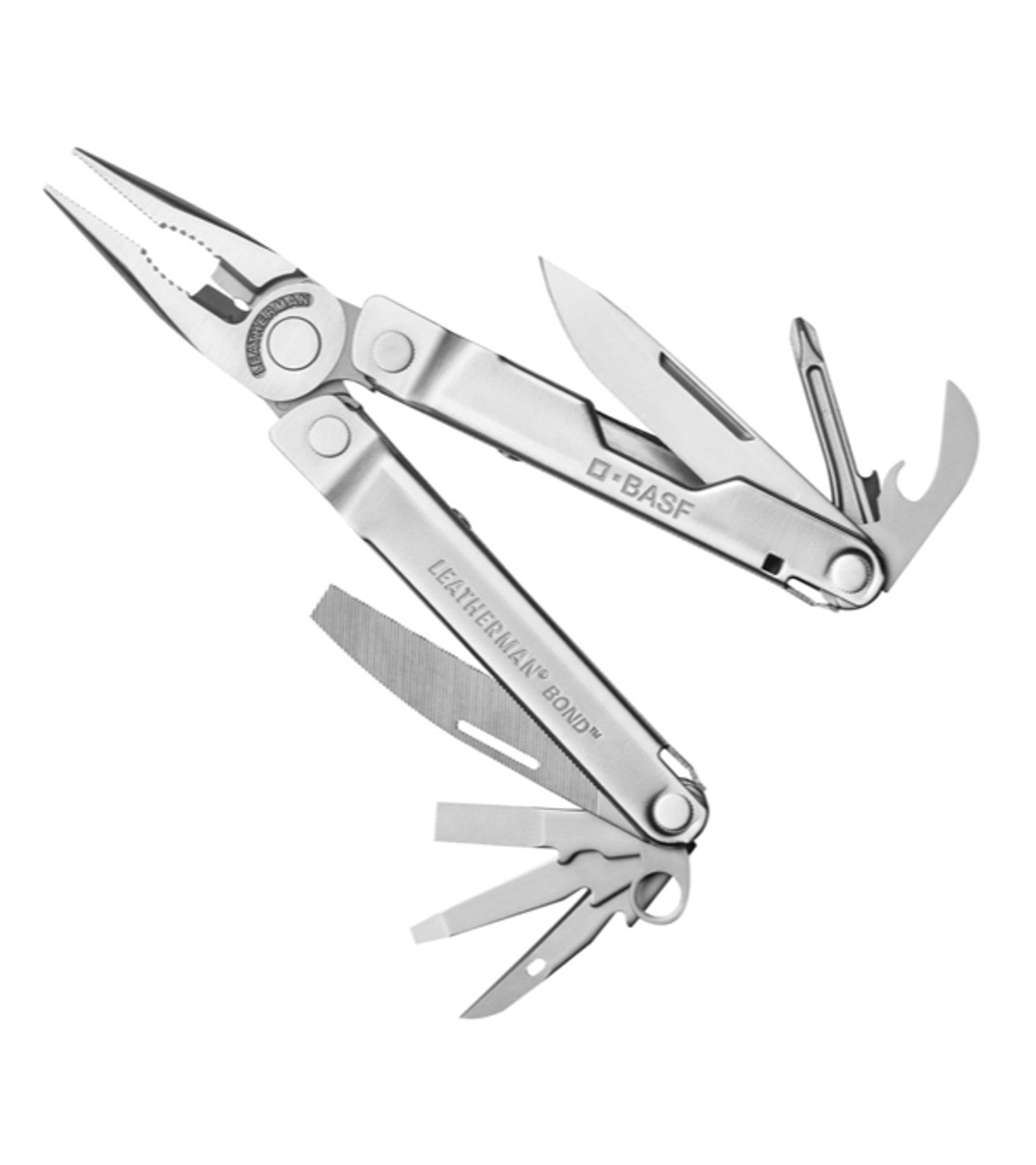 The Leatherman® BOND® 15-in-1 multitool is an impressive giveaway that keeps your company name remembered. It features a wire stripper, wire cutters, scissors, three screwdrivers and much more in its sleek, compact design. This is an easily portable gift great for a wilderness pack, auto kit or purse; all it needs is your laser engraved imprint. Stainless steel compact tool 15 useful functions Rounded handles for a comfortable grip Made in the USA of US & Foreign content Includes: needle nose pliers, regular pliers, wire cutters, hard-wire cutters, electrical crimper, 420HC knife, wood/metal file, awl w/ thread loop, Phillips screwdriver, large screwdriver, small screwdriver, can opener, bottle opener, wire stripper, ruler Laser engraved for a permanent impression Item size: 5.4375″ W x 7.125″ H x 1.25″ D Imprint area: Top: 1.5″ W x 0.125″ H (1 color max.) Imprint: Top: 1 line / 15 characters per line Applicable charges: $60.00 set up charge