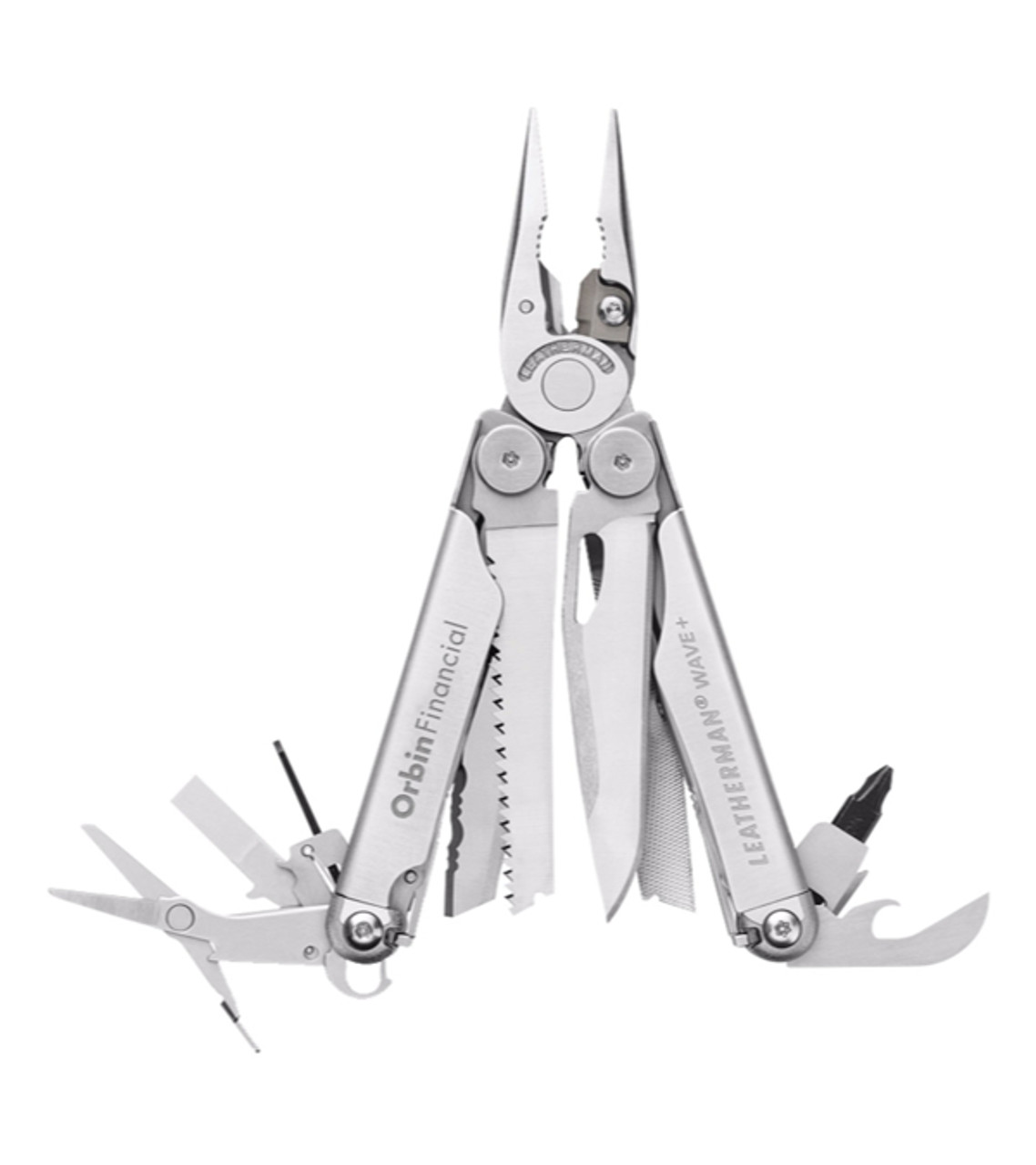 The Leatherman® Wave® is a multifunction tool featuring pliers, wire cutters, scissors, a bit driver, and more. With 18 useful tools in one, all of which lock for safety, this powerful compact gift reminds special customers and employees they can rely on your business. 18-function compact tool All-locking for safety Stainless steel Easily operated with one hand Includes Nylon sheath Includes: Needle nose and regular pliers, premium replaceable wire cutters, premium replaceable hard-wire cutters, wire stripper, electrical crimpers, 420 HC serrated knife, spring-action scissors, saw, ruler, wood/metal and diamond-coated file, bottle and can opener, large and small bit driver, medium screwdriver Made in USA Laser engraved for a permanent impression Item size: 4″ W x 1.5″ H x 0.75″ D Imprint area: Both Sides: 1.375″ W x 0.25″ H Imprint:Both Sides: 2 lines / 14 characters per line Applicable charges: $55.00 set up charge per location $0.65 per pc per additional location