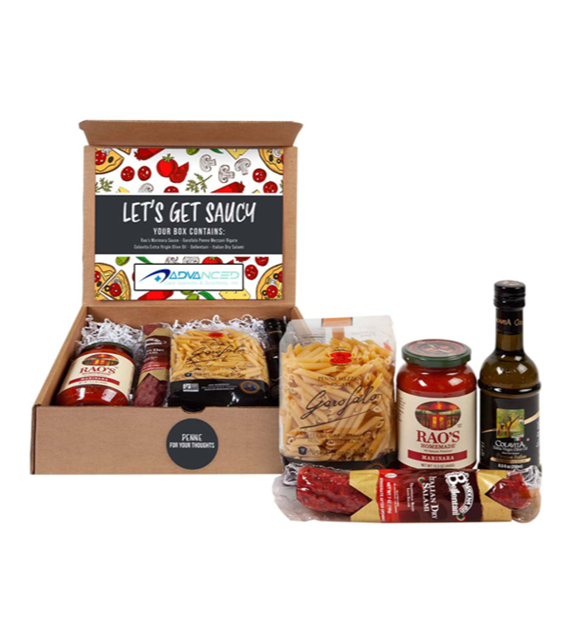 The Let’s Get Saucy Italian Gourmet Kit is a wonderful way to show appreciation for special customers and employees, or to welcome new team members on board. It comes with all the basics of an Italian dinner, including pasta, olive oil and a jar of sauce, and features your full color imprint inside the lid. Rao’s Marinara Sauce 15.5 oz. jar Garofalo Penne Mezzani Rigate 16 oz. bag Colavita Extra Virgin Olive Oil 8.5 oz. bottle Bellantini – Italian Dry Salami 7 oz. Made in USA Full-color digital label decoration inside box lid Item size: 12.125″ W x 9.25″ H x 4″ D Imprint area: Inside Lid Label: 6.5″ W x 1.5″ H (full color) Imprint: Inside Lid Label: 5 lines / 40 characters per line Applicable charges: $60.00 set up charge