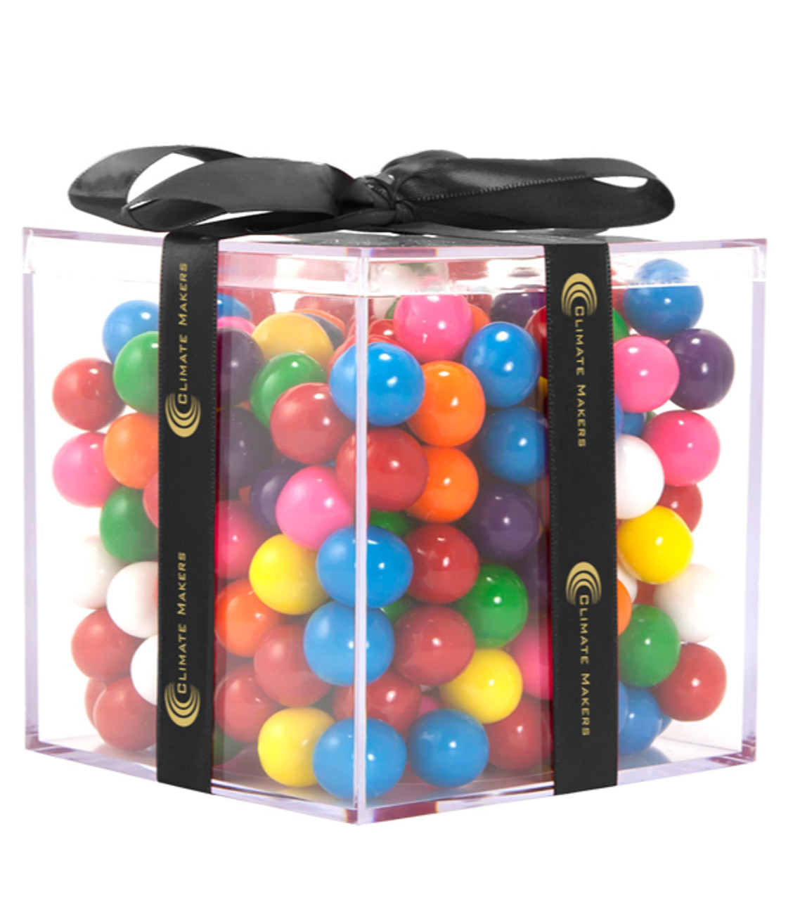 A gift that’s always fun, our promotional acrylic gift cube filled with gum balls will give the competition something to chew on. Our gift cube is ideal for a year-round promotional giveaway, and perfect for trade shows, company events, party favors, and more! Clear Acrylic gift cube filled with gum balls Wrapped with custom ribbon Foil stamped decoration on ribbon Item size: 4″ W x 4″ H x 4″ D Imprint area: Ribbon: 2″ W x 0.5″ H (1 color max.) Imprint: Ribbon: 3 lines / 24 characters per line Applicable charges: $55.00 set up charge
