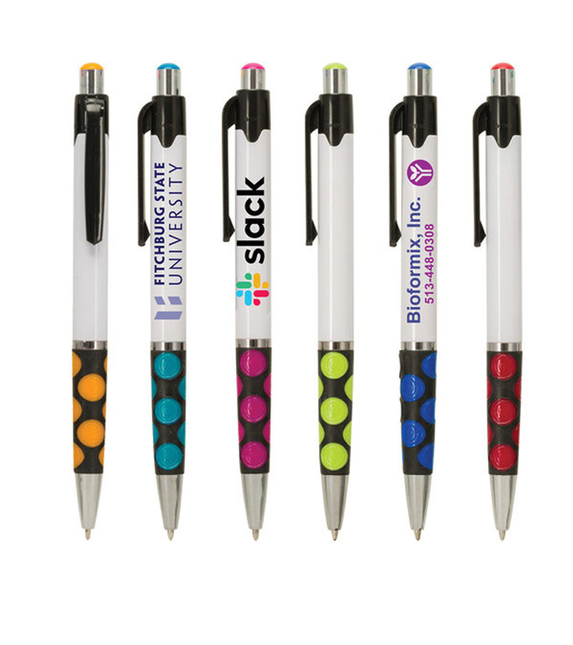 Go for a unique giveaway with the Madeline I Pen. Brightly colored spots on the grip and a matching color accent on the plunger help this promotional pen command attention and get more eyes on your imprint. This is a great way to get your brand seen and remembered at any event. Click-action ballpoint pen Colored accents on the grip and plunger Convenient carrying clip Chrome trim Plastic Full color digital decoration Item size: 5.5″ H Imprint area: Wraparound: 2.25″ W x 0.25″ H (full color) Imprint: Wraparound: 1 line / 16 characters per line Applicable charges: $30.00 set up charge