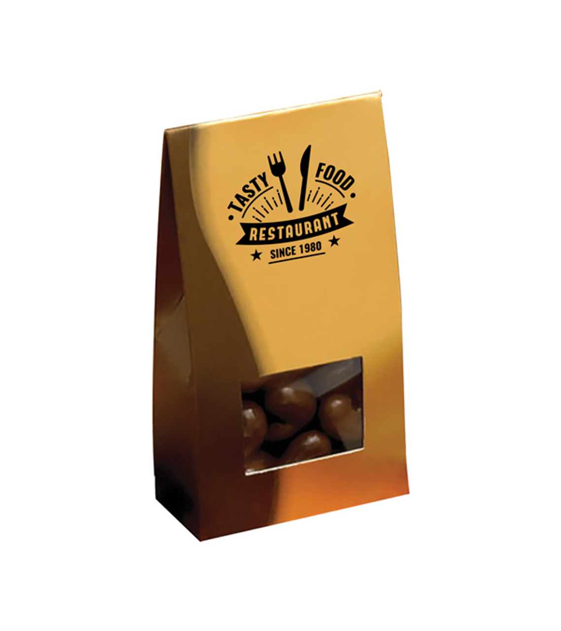 Let these attractive, imprinted treat boxes be a sweet reminder of your company or organization. Filled with chocolate-covered cashews they’re ideal for trade shows, client meetings, and table gifts for holiday parties or other company functions. Makes a great wedding favor! USA Made 2 oz. cellophane window gift box in metallic gold Hot Stamped decoration Item size: 5″ W x 2.75″ H x 1.25″ D Imprint area: 2″ W x 1″ H (1 color max.) Imprint location: top center of box Applicable charges: $60 set up charge In order to ensure the highest-quality delivery of your product, we use special insulated packaging and cool packs to protect chocolate orders from heat during warm weather months and/or when shipping to warm climates. Depending on your location, 2-day shipping may be necessary to preserve the quality of the products. Additional charges will be incurred. Please contact our CustomerService team for more information.