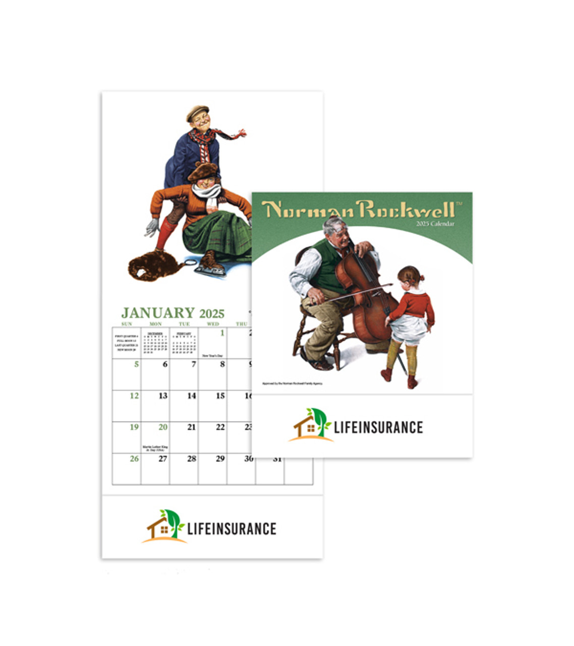 Celebrate the heartwarming artistry of Norman Rockwell every day with this charming mini calendar. A nostalgic journey through iconic illustrations, this calendar captures the essence of classic American moments, making each day a delightful trip down memory lane. 12-Month Mini Calendar Gloss Paper Stock with UV Coated Cover High-quality Imagery The FSCĀ® label means that the materials used for this product come from well-managed FSCĀ®-certified forests and other controlled sources. Full color digital decoration Item size: 5.75″ W x 6.875″ H Imprint area: Front: 5″ W x 0.75″ H (full color) Imprint: Front: 4 lines / 12 characters per line Imprint charges: $14.95 set up charge