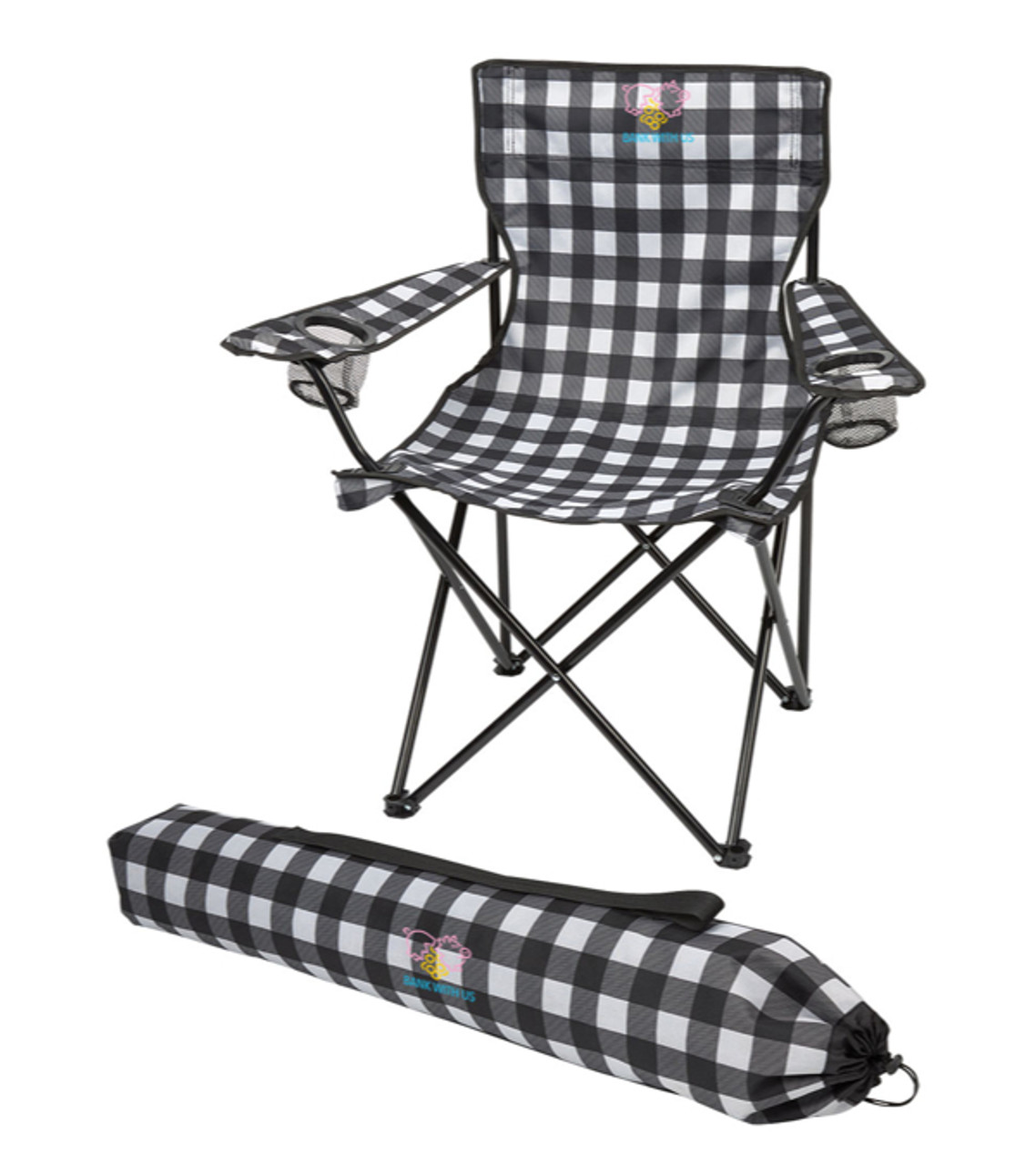 These Polyester/PVC folding chairs make convenient places to sit at fairs, festivals and other outdoor events. When it’s time to get up, the chairs can easily be stowed in their carrying cases. Your customers will thank you for saving them a seat every time they see your imprint on their chair. Includes carrying bag with shoulder strap and drawstring closure Each arm rest has built-in mesh cup holder Steel tubular frame Holds up to 300 pounds Heat Transferred decoration Item size:Open: 32″ W x 34″ H x 20″ D; Folded: 36″ L x 9″ H Imprint area: Front Chair: 12″ W x 3.25″ H; Bag:12″ W x 3.25″ H (4 colors max.) Imprint: Front Chair; Bag: 4 lines / 30 characters per line Applicable charges: $60.00 set up charge per color per location (4 colors, 2 locations MAX) $0.50 per pc per additional location