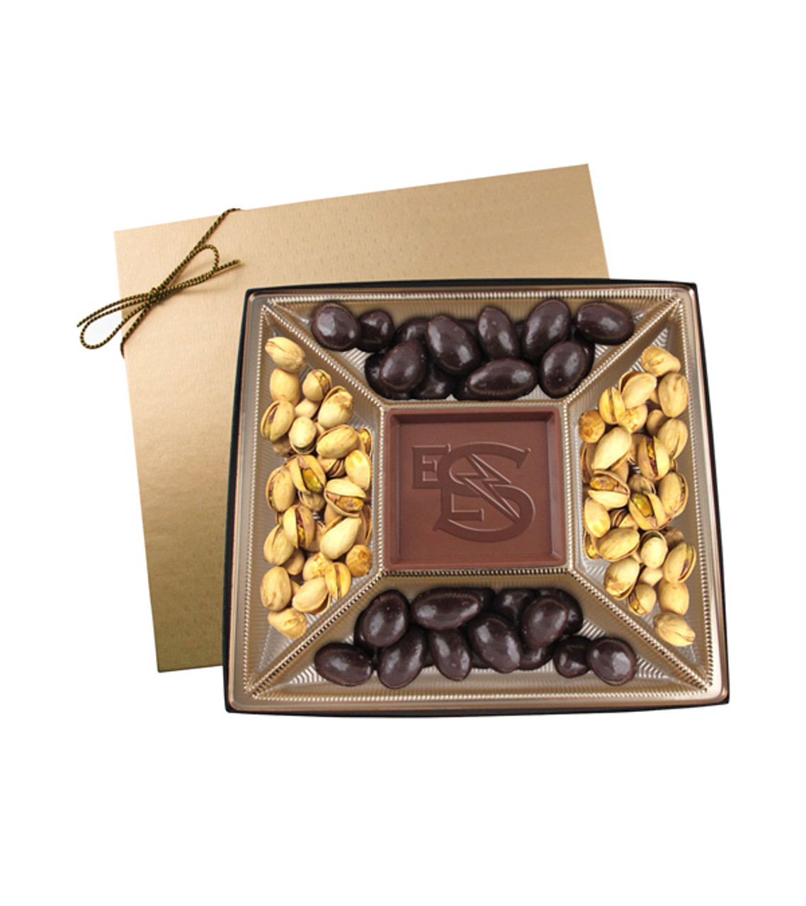 Give nut lovers what they really want this holiday season with our small custom chocolate covered almonds and pistachio gift box! Perfect for sharing with many, or just for one, our gift box features dark chocolate covered almonds and salted pistachios surrounding a milk or dark Swiss chocolate centerpiece. Our gift box is delectably the perfect holiday gift! Made in USA. Item size: 7.75″ W x 7″ H x 1″ D Imprint area: Chocolate centerpiece: 2.25″ W x 2″ H Imprint: Chocolate centerpiece: 4 lines / 16 characters per line Applicable charges: $70 mold charge In order to ensure the highest-quality delivery of your product, we use special insulated packaging and cool packs to protect chocolate orders from heat during warm weather months and/or when shipping to warm climates. Depending on your location, 2-day shipping may be necessary to preserve the quality of the products. Additional charges will be incurred. Please contact our Customer Service team for more information.