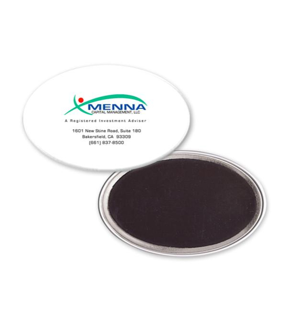 Add some dimension to your promotions with this custom oval button magnet. Personalize it with your company logo and graphics to get eye-popping marketing results! Create a unique promo by designing your own advertising magnet at no extra charge! Use your own artwork, fonts and logos. For more information call our Customer Care team at 1-877-803-3358. Oval button with 35 mil magnet backing Full color digital decoration Item size: 2.75″ W x 1.75″ H x 0.25″ D Imprint area: 2.75″ W x 1.75″ H (full color) Imprint: 8 lines / 22 characters per line Applicable charges: $60.00 set up charge