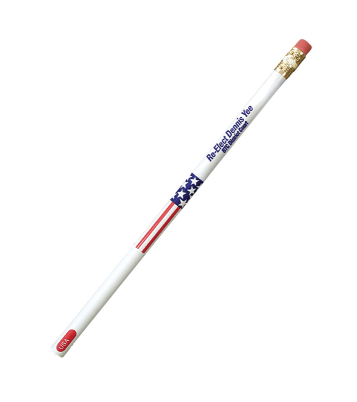 To promote your logo, white is a stand-out choice! This American made promotional product features a gold ferrule and non-smudge eraser. This decorated patriotic pencil is the perfect giveaway at any trade show, fundraiser or business advertising event. You can customize this advertising specialty in red or blue imprint. Made in the USA #2 graphite Stars and stripes design Wood body, brass ferrule with pink eraser Screen-printed decoration Item size: 7.5″ H Imprint area: Barrel : 2.5″ W x 0.75″ H (2 colors max.) Imprint: Barrel : 5 lines / 20 characters per line Applicable charges: $15.00 set up charge