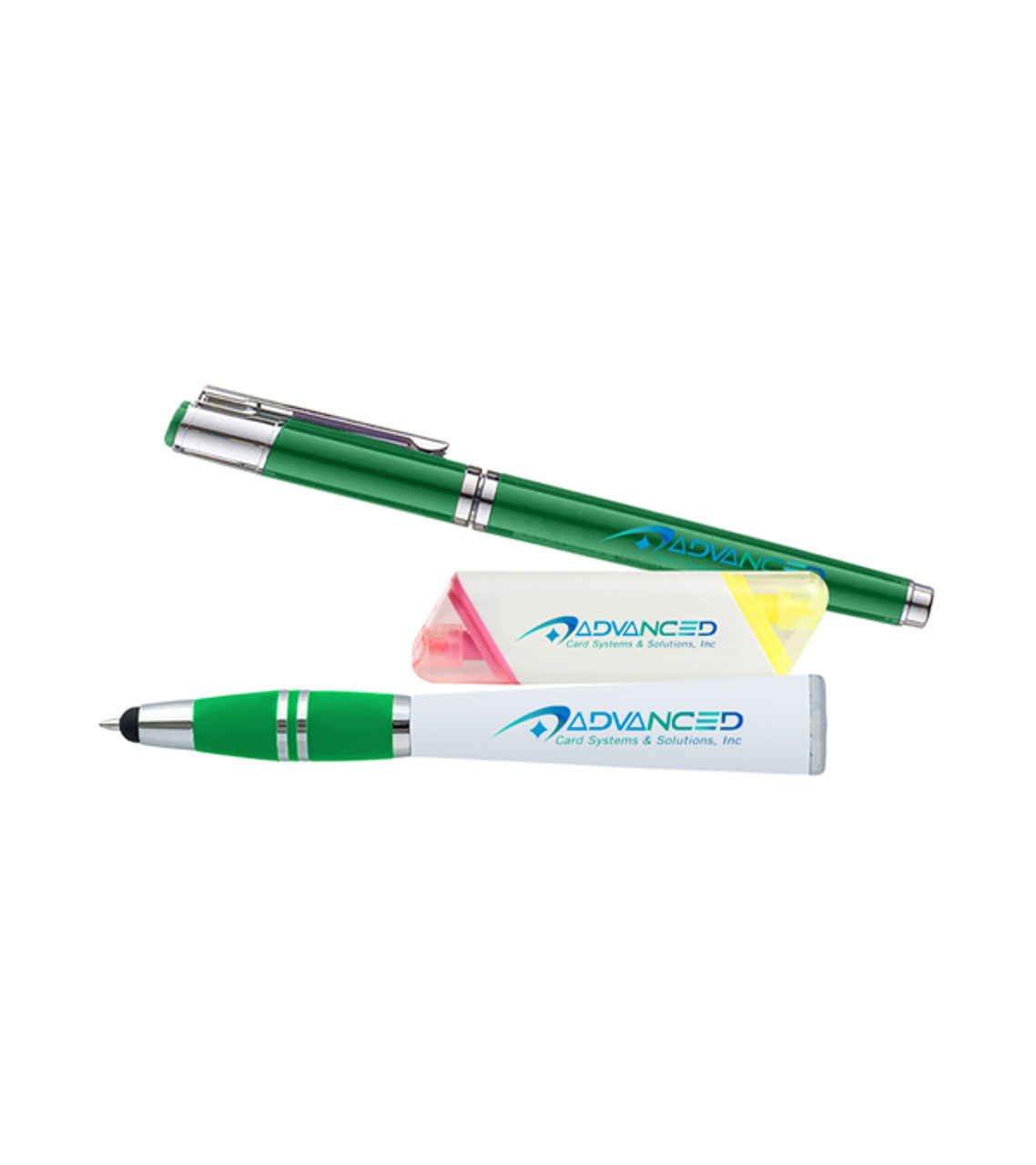 The Pen Highlighter Combo is a practical business gift that they’ll appreciate. It includes a custom pen with stylus in a unique four-sided design that gets your full-color message noticed anywhere. There’s also an upscale gel pen for premium writing performance and a 2-sided highlighter that makes it easy to mark information. Ideal for conventions, trainings, employee onboarding and more. It will help attendees recall your message along with all the must-know details from the event. Ballpoint pen with stylus is click-action retractable Ballpoint pen features a colored grip and offers 4 imprint areas for maximum exposure Cap-action gel pel features a textured ribbed grip for style and comfort 2-sided highlighter comes with yellow and pink highlighter tips Full color digital decorations Item size: Square shaped pen: Side 1,2,3&4: 5.25″ H Gel pen: Pen barrel front: 5.50″ H Highlighter: Front & Back: 4″ H Imprint area: Square shaped pen: Side 1,2,3&4: 2.875″ W x 0.5625″ H (full color) Gel pen: Pen barrel front: 2.75″ W x 0.28″ H (full color) Highlighter: Front & Back: 2.75″ W x 0.75″ H (full color) Imprint: Square shaped pen: Side 1,2,3&4, Gel pen: Pen barrel front, Highlighter: Front & Back: 2 lines / 26 characters per line Imprint charges: $24.95 set up charge