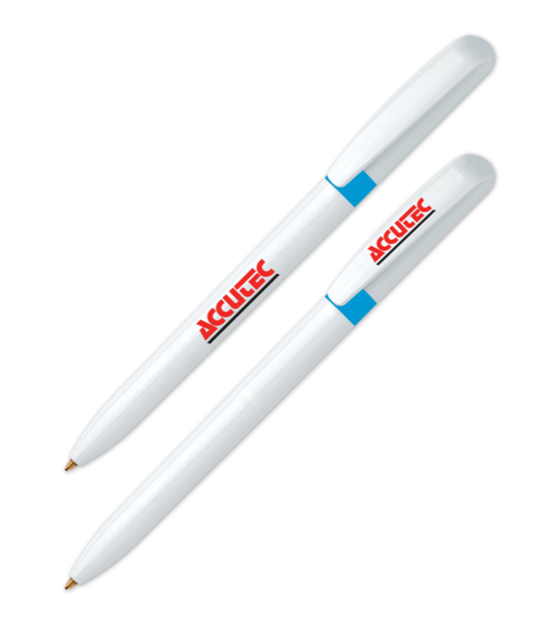 The Pivo White pen’s colorful ring attracts attention, putting your custom message in the spotlight, where it belongs! This is a great giveaway for any tradeshow, seminar or community event. Sleek, slim profile. Twist-action retractable medium ballpoint Plastic Convenient clip Screen-printed decoration Item size: 5.5938″ H x 0.5625″ Dia Imprint area: Barrel: 2″ W x 0.75″ H (2 colors max.) / Clip: 1″ W x 0.15625″ H (1 color max.) Imprint: Barrel: 4 lines / 28 characters per line Clip: 1 line / 14 characters per line Imprint charges: $24.95 set up charge $0.10 per pc per additional color/location