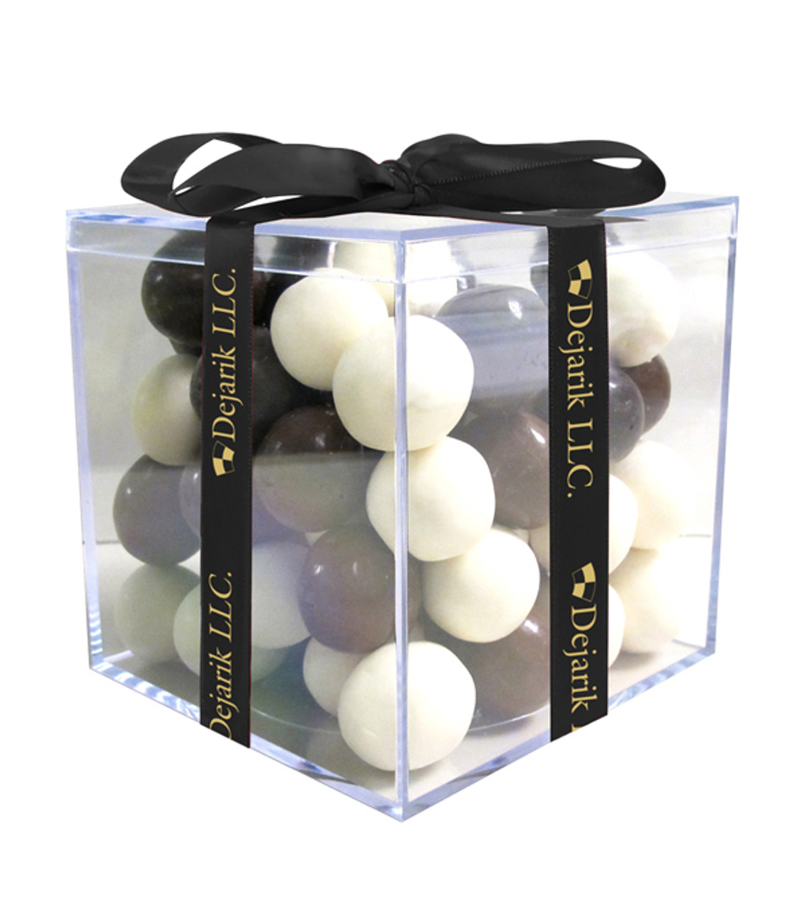 Customers and employees will love this sweet promotional treat! Clear acrylic cube is filled with either milk and white, or dark and white chocolate covered malt balls. A sweet gesture of appreciation at company events or for the holidays. Clear Acrylic gift cube filled with malt balls Wrapped with custom ribbon Foil stamped decoration on ribbon Item size: 4″ W x 4″ H x 4″ D Imprint area: Ribbon: 2″ W x 0.5″ H (1 color max.) Imprint: Ribbon: 3 lines / 24 characters per line Applicable charges: $55.00 set up charge In order to ensure the highest-quality delivery of your product, we use special insulated packaging and cool packs to protect chocolate orders from heat during warm weather months and/or when shipping to warm climates. Depending on your location, 2-day shipping may be necessary to preserve the quality of the products. Additional charges will be incurred. Please contact our Customer Service team for more information.